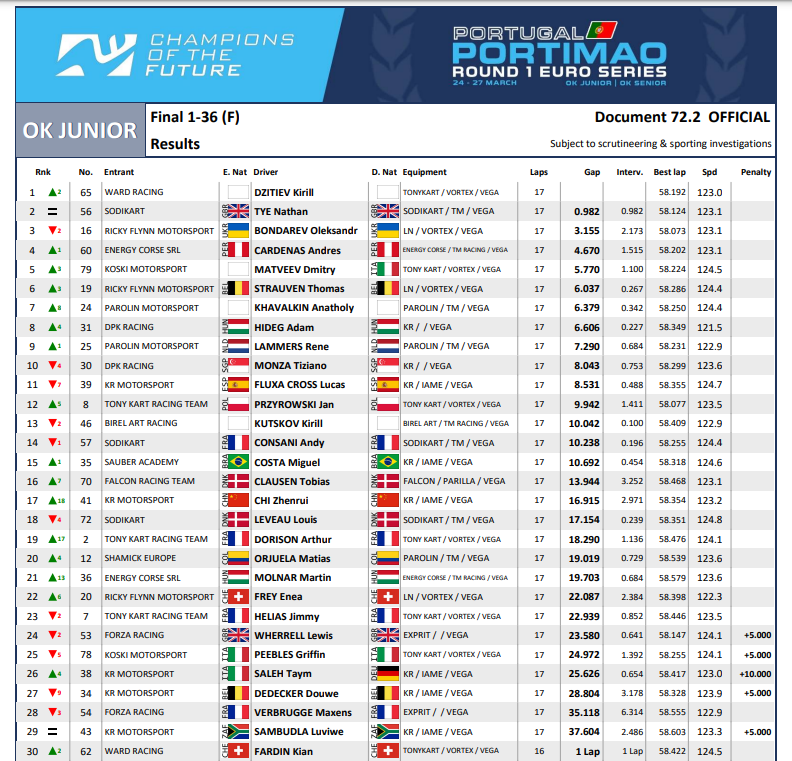 «Головну роль у «Портімао» зіграв Олександр Бондарев (RFM). Він зайняв поул-позицію, але втратив свою загальну перевагу Натану Тай (Sodikart), а потім відновив її в кінці Супер-Хіта проти свого суперника. У фіналі Тай був поза межами першого ряду і втратив багато місць на старті. Бондарева швидко обігнав Кирило Дзітієв (Ward Racing), який потім намагався нав’язати гонці дуже сильний ритм. Тай дуже швидко оговтався після важкого старту, щоб скоротити відставання від лідерів. Йому вдалося відновити своє 2-е місце проти Бондарева, якого тоді хвилював Андрес Карденас (Energy Corse). Після багатьох інтенсивних кіл позиції більше не змінилися. Пілоти OK-Senior та OK-Junior та їхні команди тепер готові до першого раунду чемпіонату Європи з картингу FIA, який відбудеться в Портімао з 7 по 10 квітня», – говориться в повідомленні.