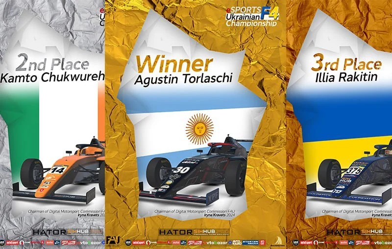 Отже розпочнемо з переможця Відкритого Міжнародного Чемпіоната «ESPORTS UKRAINIAN F4 CHAMPIONSHIP». Ним став пілот з Аргентини Агустін Торлащі, вітаємо з ПЕРМОГОЮ!!! Агустін частіше всіх був на подіумі, а на останньому Етапі в Цукубі взагалі заробив дуже великий шолом, вигравши кваліфікацію, першу і другу гонки, і ще й поставив найкращі кола. Вітаємо!