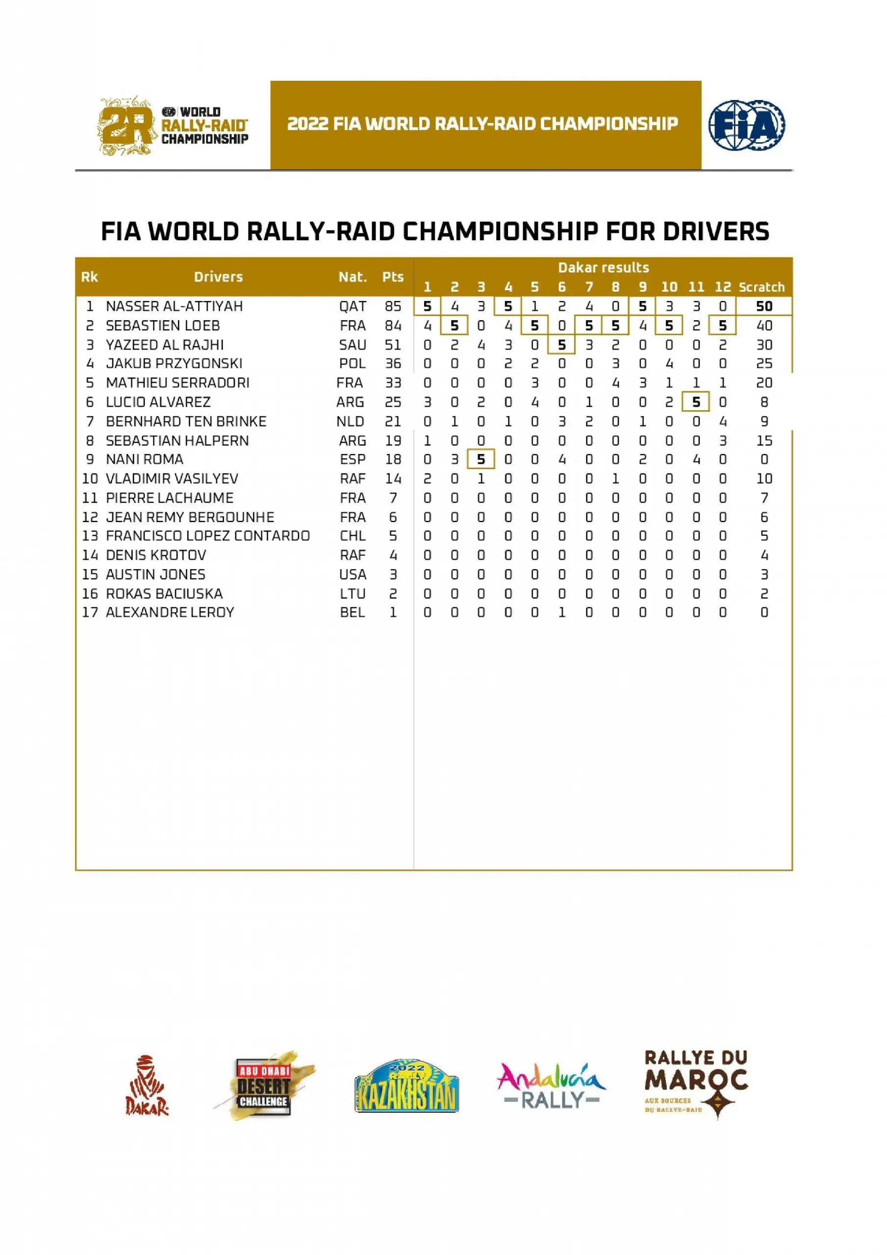 Хоча Стефан і не змагався вже ні за що, останні два дні пройшли у відносному спокої. Карлос Сайнс та Лукас Крус довели здобуток Audi RS Q e-tron до чотирьох виграних допів ділянкою у 346 км, а в п’ятницю й Латеґан Каммінґсом не страхували, слідуючи одразу за лідером команди, як напередодні, а й для себе найшвидше промчали фінальні 164 км. Щоб на фініші Нассера Аль-Аттію та Матьє Бомеля привітати з перемогою. Четвертою з трьома командами для катарця. Для бренда Toyota та моделі Hilux цей успіх став номером два, після 2019-ого року – фінального в Південній Америці. Француз Матьє Бомель виграє з Нассером утретє. Себастьєн Льоб повторює своє найкраще південноамериканське досягнення, фінішуючи другим. І, що цікавіше, у заліку пілотів W2RC він програє лише один бал Аль-Аттія, оскільки рівно у половині випадків був на трасі швидшим за суперника. А попереду ще 4 етапи новоствореного Чемпіонату Світу. Язід Аль-Раджі також стабільно провів гонку та разом із британцем Майклом Орром досяг подіуму – вперше для представників Саудівської Аравії. Гонщики виступали на Toyota Hilux команди Overdrive. Дев’яте місце фактично новачків – Маттіаса Екстрьома/Еміля Берґквіста та Audi RS Q e-tron роблять саме цей колектив загрозою лідерам наступного разу.