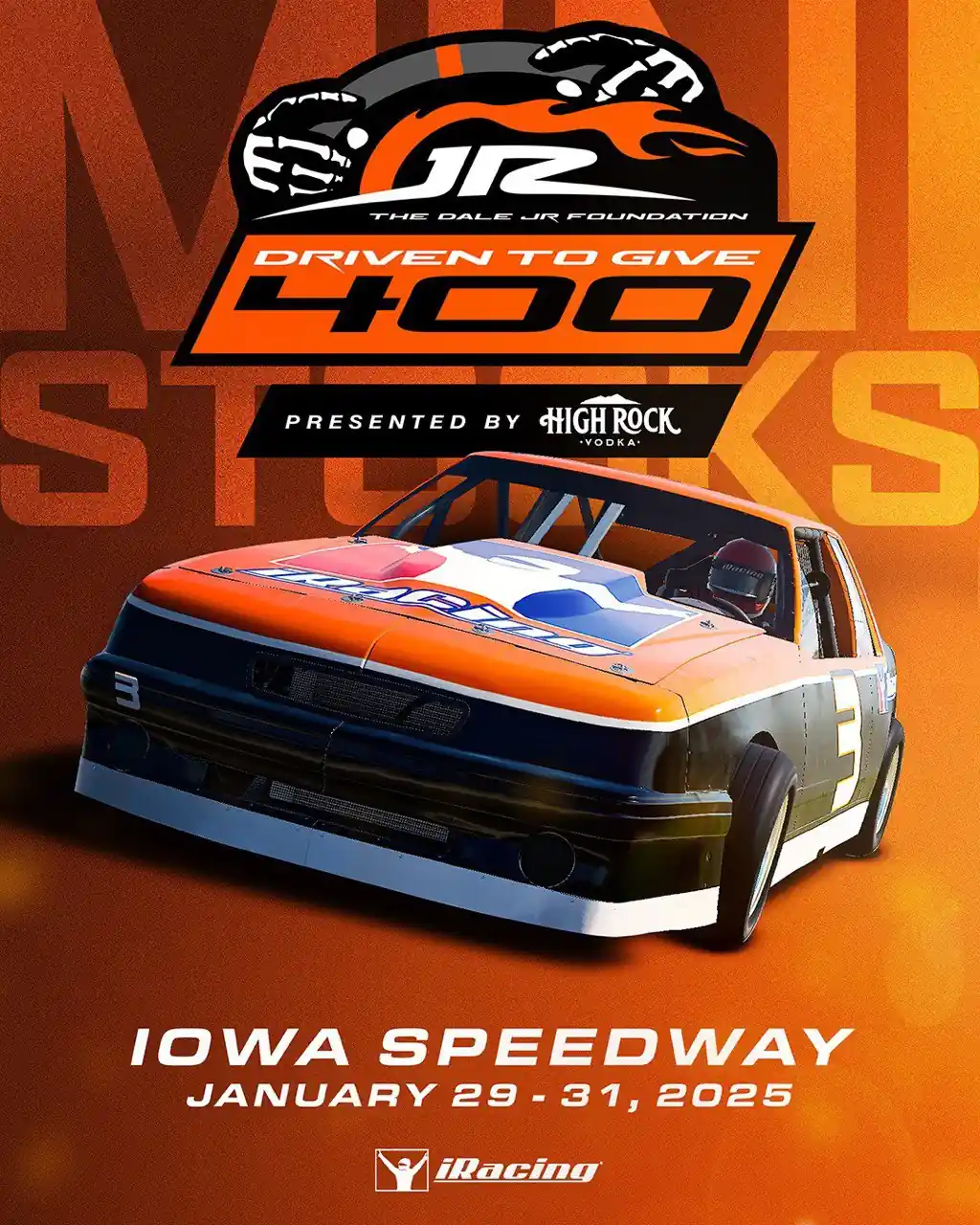 Трансляція основного заходу включатиме гонку на 40 віртуальних автомобілів Mini-Stock на Iowa Speedway у iRacing. В заїзді візьмуть участь Ернхардт Джуніор, гонщики JR Motorsports Джастін Олгаєр, Семмі Сміт, Карсон Квапіл та Коннор Зіліш, колишня зірка JRM Джош Беррі, Раджах Карут, легенда Інді Кар Тоні Канаан та багато інших. Якщо ви хочете взяти участь у трансляції, ви можете зареєструвати свою команду з 4 осіб (400 доларів за команду / 100 доларів за особу) тут: Вхід команди - 4 гонщики. У трансляції буде необмежена кількість швидких ремонтів, тоді як заїзд для широкої публіки матиме лише один. Попередження будуть вимкнені для всіх гонок, крім тих, що куплені під час трансляції.