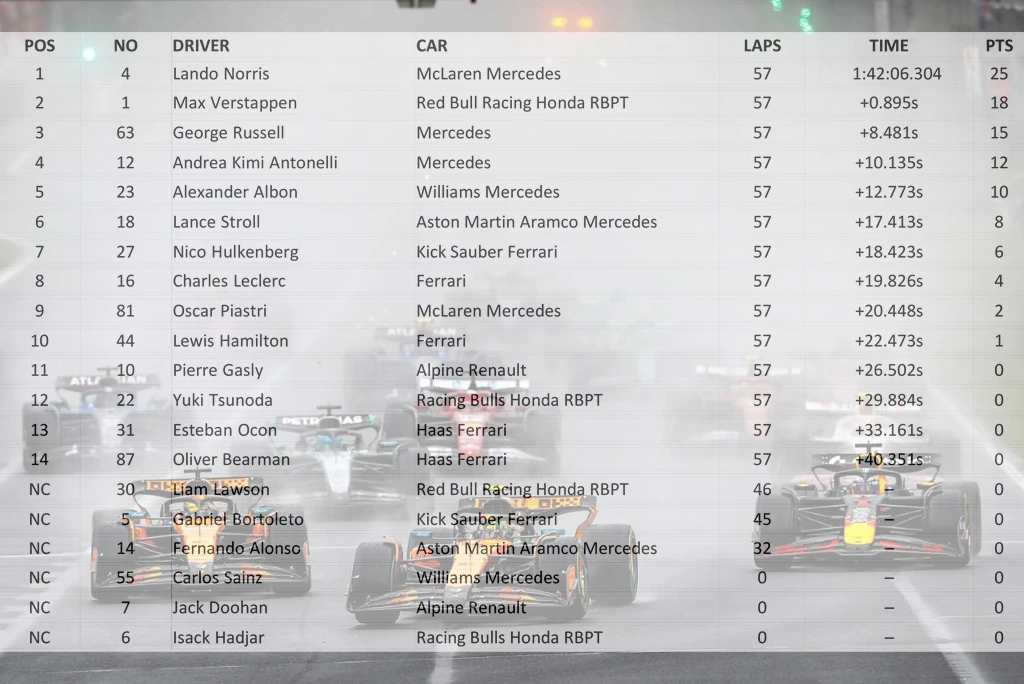 Першим до фінішу дістався Ландо Норріс, який вперше здобув перемогу у Гран прі Австралії та здобувши п'яту перемогу в кар'єрі. Він провів блискучу гонку і зміг протистояти не тільки суперникам, а й стихії, що розбушувалася. Друге місце зайняв Макс Ферстаппен. На третю сходинку подіуму піднявся Джордж Рассел з Mercedes, а найкращим із новачків став його партнер по команді Кімі Антонеллі, який фінішував четвертим.