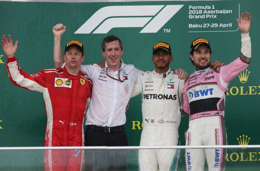 Феттель у свою чергу мав проблеми. Завдяки високій максимальній швидкості його випередив Перес, який потім завдяки цій же перевазі втримав позаду німецького пілота. Мексиканець, як і два роки тому, знову опинився на подіумі в Баку!