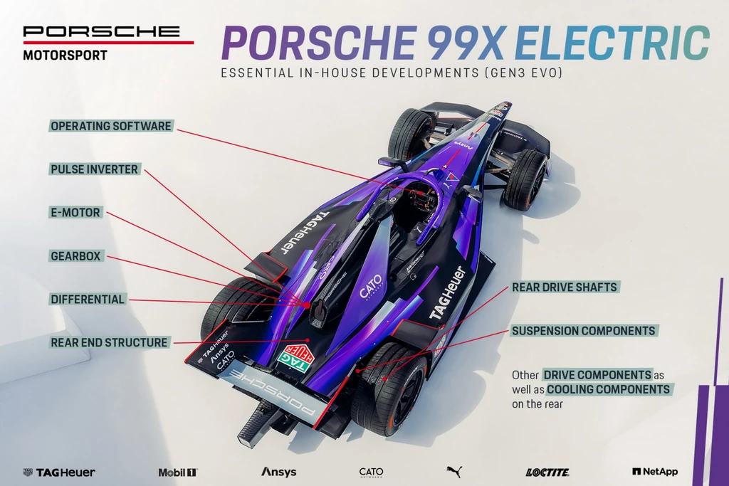 Еволюційна модель успадкувала найуспішніший на сьогодні спорткар власної формули Porsche. У версії GEN3 Porsche 99X Electric два роки поспіль вигравав чемпіонат світу серед пілотів: із Деннісом у сезоні 2022/2023 і з Верляйном у сезоні 2023/2024. Концепція залишається незмінною, адже згідно з регламентом, доступна енергія обмежена. Тому команди та пілоти оптимізують ефективність автомобілів у всіх напрямках. Компоненти, розроблені виробником, дозволили замінити для GEN3 Evo. Відділ розробки Porsche у Вайссаху скористався можливістю використати потенціал оптимізації, виявлений за останні два сезони, особливо щодо привода. Омологація компонентів виробника дійсна ще протягом двох сезонів. Четверте покоління автомобілів, GEN4, представлять у 13-му сезоні (2026/2027).