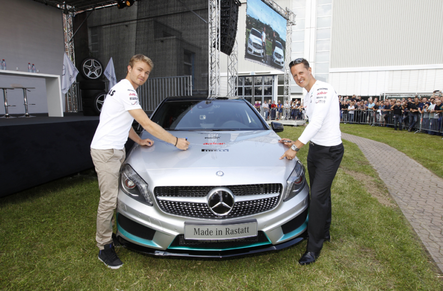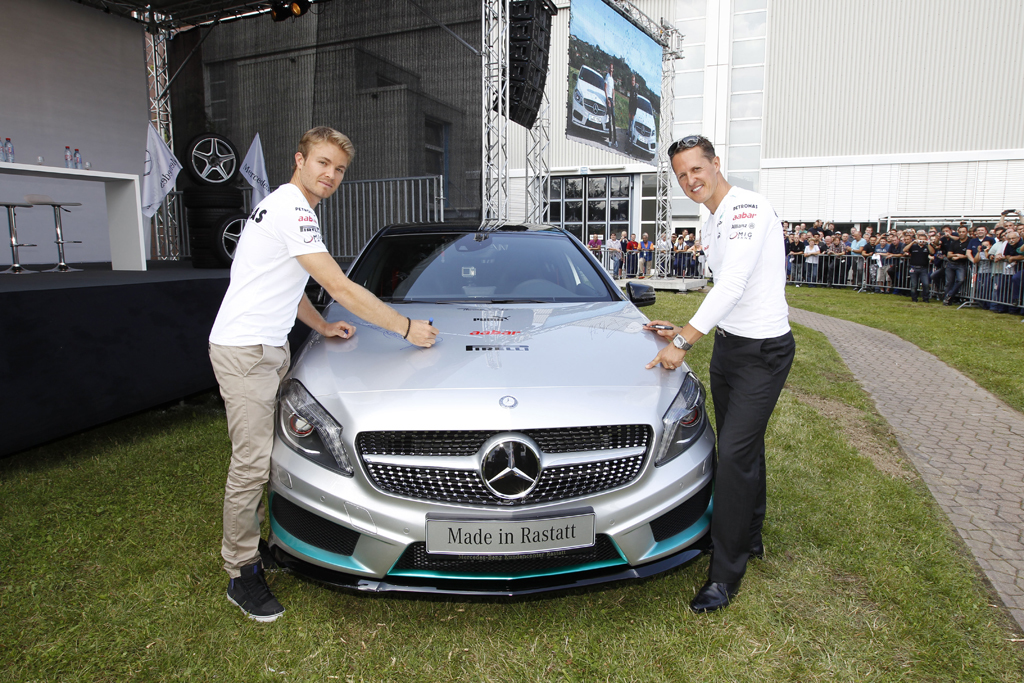 В цехах ателье Михаэль Шумахер и Нико Росберг приняли участие в сборке двигателя для M 157 V8, который затем был установлен на автомобиле Mercedes-Benz CLS 63 AMG Shooting Brake. При сборке 5,5-литровой «восьмерки» на плечи, а точнее, на руки пилотов Ф1 была возложена задача провести монтаж в двигатель поршней и головки блока цилиндров. После чего, следуя философии ателье AMG «один человек – один двигатель», требующей личной ответственности мастера, собирающего двигатель, вместе с курирующим их механиком Михаэль и Нико оставили свои подписи на шильдике двигателя, чтобы будущий владелец автомобиля знал, кого благодарить за качество сборки силового агрегата.