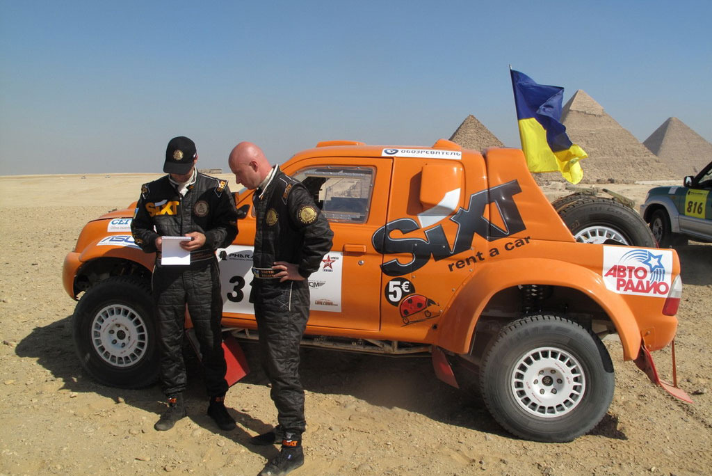 Ехать приходится осторожнее, беречь колеса, а это сказывается на скорости. Кроме этого попадаются очень сыпучие пески. Даже на ровной поверхности было трудно тронутся с места. Мы попробовали пройти сначала на высоком давлении этот участок, но не вышло и мы понизили давление в шинах с 2 до 0,5 атмосфер. Только после этого мы выбрались из песчаной ловушки. Потеряли немного времени минут 15-20.» В конце первого этапа все команды прибыли в первый бивуак (гоночный лагерь) находящийся в районе называемым Тибния. Здесь команды проведут еще одну ночь, а потом отправятся на юг Египта вглубь пустыни Сахара.