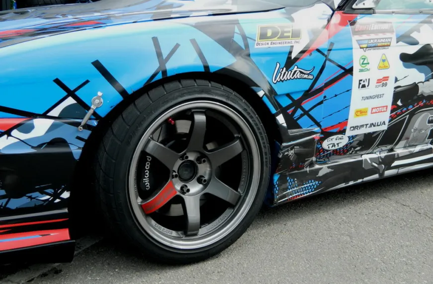 – Первый критерий выбора: впереди должен стоять полуслик резины. Для сухой трассы такие шины должны иметь очень низкий показатель Treadwear, который обозначает мягкость резины. Во время тренировок и соревнований передние шины практически не меняются. Сзади стоят китайские, но они свежие, поэтому работают. Если без экономии с тренировкой уходит от 14 до 16 штук. При средней мощности дрифтового автомобиля они должны давать хорошее сцепление, чтобы контролировать занос, иначе ты будешь просто либо не разворачиваться, либо не доворачиваться.