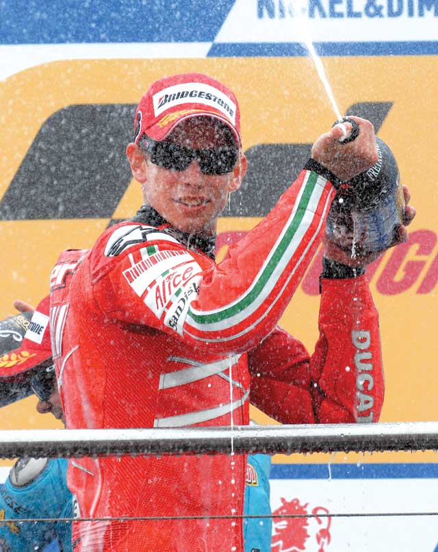 Не быть в этом году Валентино Росси в шестой раз чемпионом. Ставлю свои отпускные на новобранца Ducati Кейси Стоунера! Австралиец уже в первых гонках умудрился совладать с громоподобным (в смысле мощности и управляемости) Ducati GP, чего не смогли маститые Лорис Капиросси, Карлос Чека и Алекс Барруш. И теперь Кейси не остановить. Перед британским этапом только и было разговоров, что «Донингтон-парк» как никакой другой подходит для Yamaha, поскольку в дождь Ducati будет лишен своего главного преимущества – ураганной динамики. И действительно, в квалификации Колин Эдвардс и Росси показали лучшие результаты, а Стоунер стартовал только 5-м. Но в самой гонке австралийцу снова не было равных: обойдя обоих поулменов и заводских гонщиков Repsol Honda HRC Дани Педрозу и Ники Хейдена, Кейси стремительно оторвался на 10 секунд. И уверенно победил в пяти из восьми состоявшихся этапов. Эдвардс, который в следующем сезоне будет выступать за дочернюю для Yamaha конюшню Тech3, так и остался вторым, а вот Росси за четыре круга до финиша обогнал первый номер Rizla Suzuki Крис Вермюлен. Впрочем, удивляет, что итальянец вообще добрался до финиша: в последней четверти гонки казалось, что протертая до корда задняя покрышка его байка вот-вот разлетится на куски. Но, видимо, тем и отличаются мэтры от просто быстрых пилотов, что могут выжать максимальный результат даже в неблагоприятных условиях.
