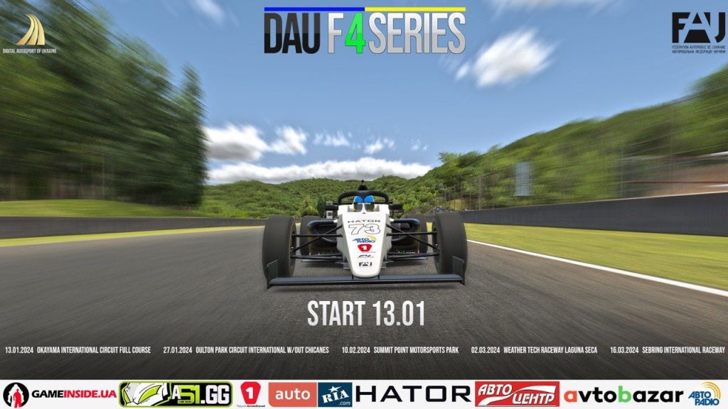 Комісія Цифрового Автоспорту запрошує прийняти участь у Міжнародній Серії змагань на Формулах-4 під назвою DIGITAL AUTOSPORT OF UKRAINE: F4 Series-2024. Season 1 (DAU F4 Series) на симуляторі iRacing.