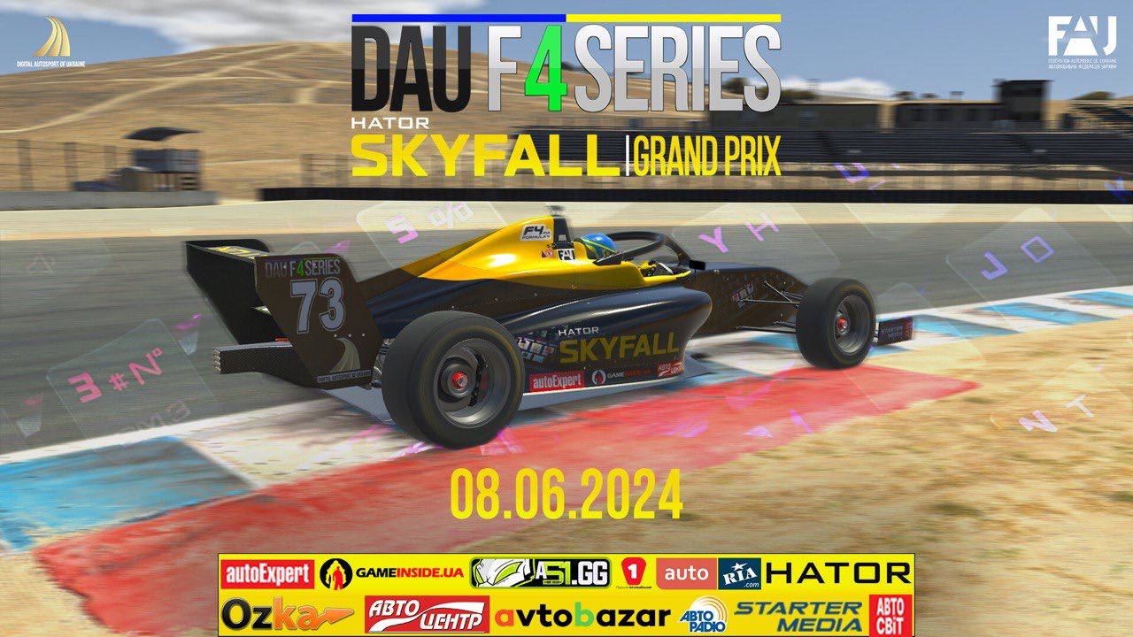 Запишіть свої календарі: 8 червня 2024 року наша команда, Комісія Цифрового Автоспорту, проведе ТРЕТІЙ етап Skyfall Grand Prix Laguna Seca Міжнародної Серії змагань на Формулах-4 під назвою DIGITAL AUTOSPORT OF UKRAINE: F4 Series-2024. Season 2 (DAU F4 Series) на симуляторі iRacing.