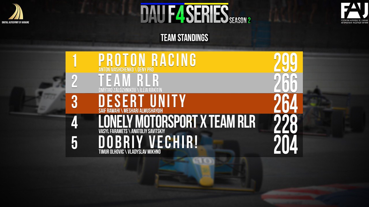 У турнірному заліку команд лідирує Proton Racing, за якою слідують RLR Proton Racing та Desert Unity