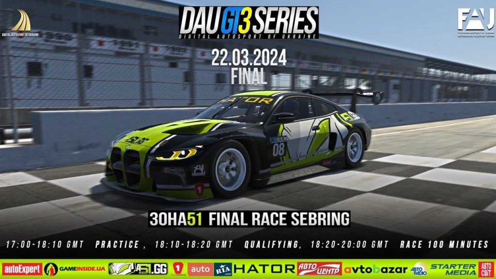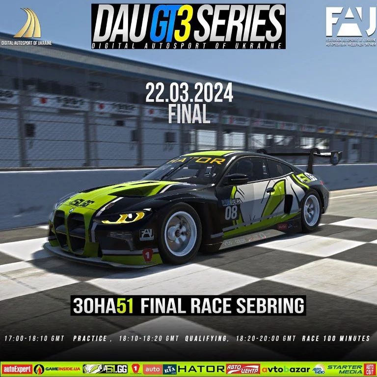 В цю п’ятницю 22 березня о 20-00 вмикайтесь в прямий ефір фінального шостого Етапу DAU GT3 Series 2024 Зона51 Race Sebring на youtube КЦА ФАУ.