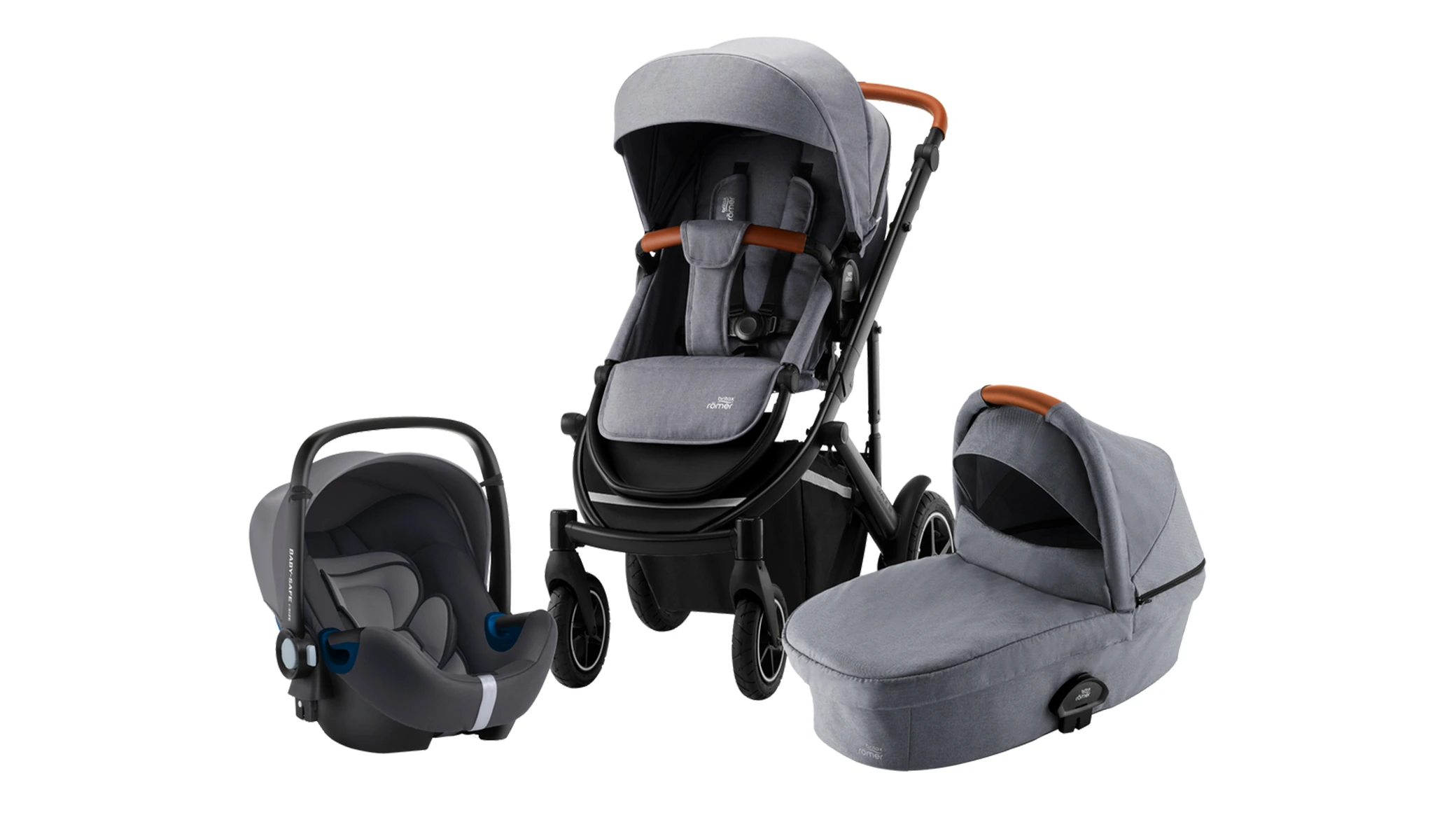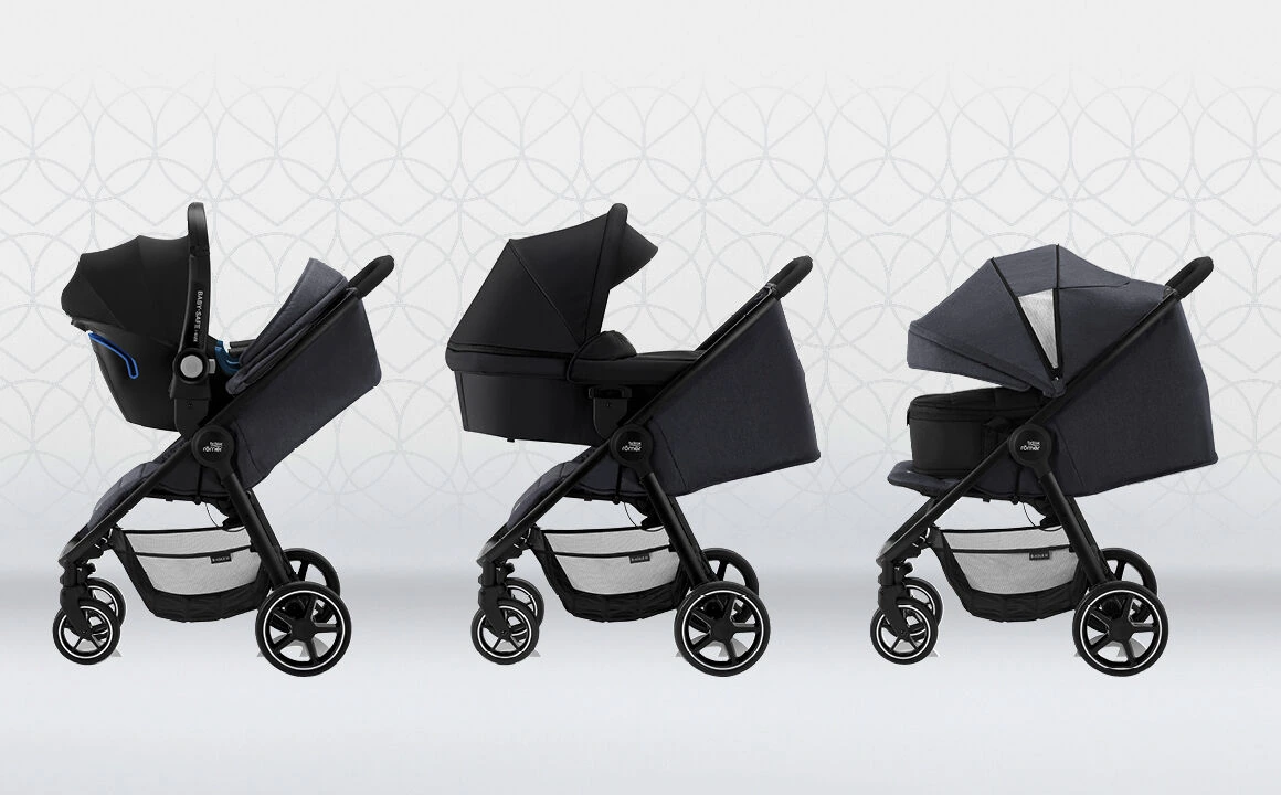 Універсальні моделі Britax Römer представлені комплектами з прогулянкової коляски SMILE III та додаткових модулів - це системи для подорожей Essential і Comfort.