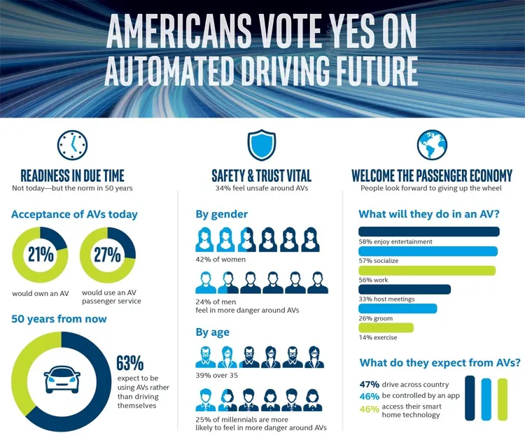 По результатам исследования, которое проводила недавно Intel, компания сделала вывод – пользователи городов пока еще с опаской относятся к транспортным средствам, оснащенным системой автопилотирования.