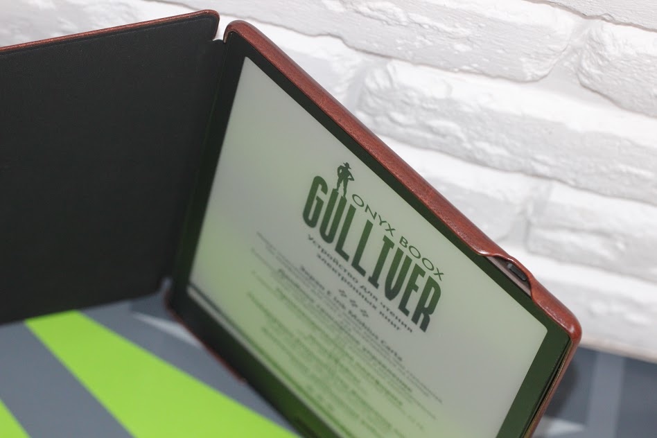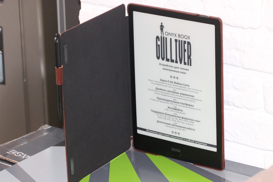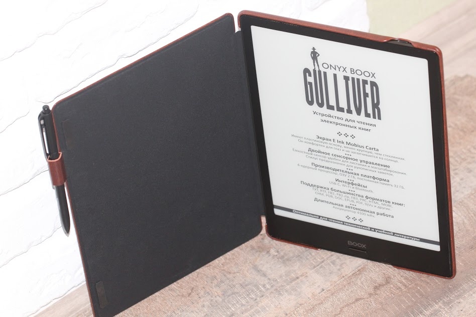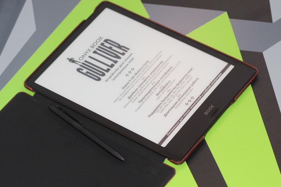 Здесь два сенсорных слоя. На практике такое решение позволяет работать с экраном, как простым пальцем руки, так и имеющимся в комплекте поставки стилусом. Экран Gulliver-а – это сочетание индукционного сенсора WACOM, поддерживающего 2048 степеней нажатия, и емкостного multitouch-а. Весьма удобное перелистывание страниц пальцами, масштабирование и многое другое. Ну и стоит также отметить E Ink Mobius Carta – это матрица, которая уже успела себя зарекомендовать тем, что предлагает максимальное сходство с бумажными книгами – шрифты не плывут, а прорисовка их как в лучшей полиграфии. Да и пластиковая подложка поверх в этом плане также плюсиков добавляет.