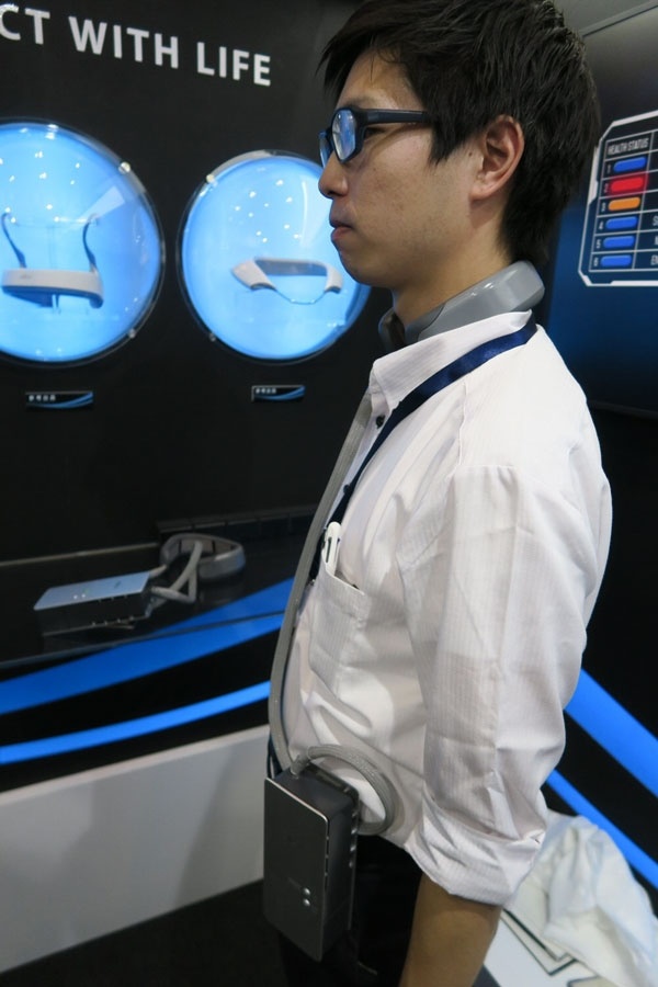 На выставке Ceatec Japan 2018 компания Fujitsu General показала результаты чертежей так называемого носимого кондиционера – полностью рабочий прототип устройства. Гаджет надевается на шею, и фактически отводит тепло от шейной артерии, предотвращая, таким образом, перегрев головы с последующим риском получить тепловой удар. Согласно данным производителя, отвод тепла осуществляется при помощи трех элементов Пельтье. Так, при подаче питания на элементы, одна из сторон становится холоднее, а вторая нагревается. В свою очередь же, циркулирующая в кондиционере жидкость отводит тепло в блок с радиатором на поясе пользователя, откуда оно уже рассеивается вокруг.
