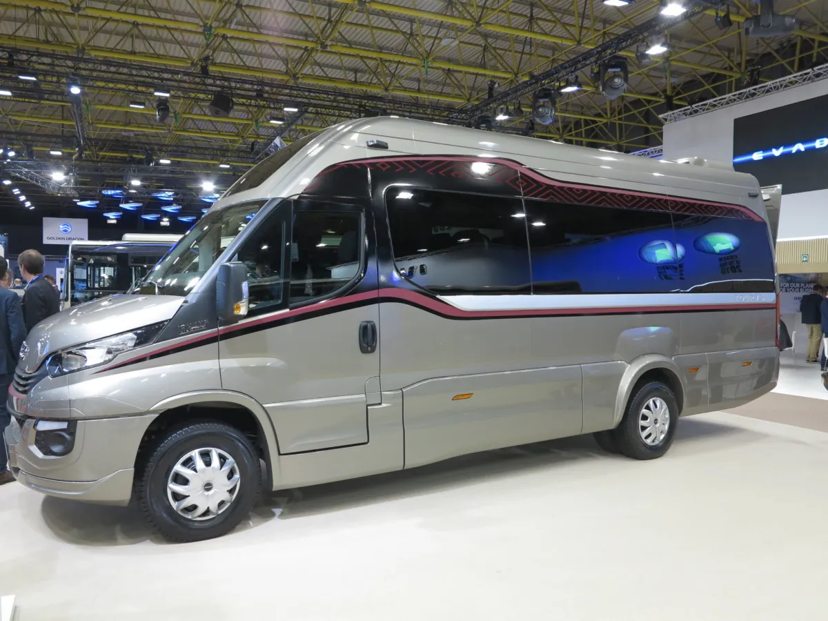 Первая – это туристический автобус малого класса IVECO Daily Tourys. Его длина 7498 мм, ширина – 2174 мм и высота 3100 мм. Внешне машина отличается панорамным лобовым стеклом площадью 2,5 м кв с эффектной верхней вставкой, молдингами под алюминий на бортах и эффектной окраской.