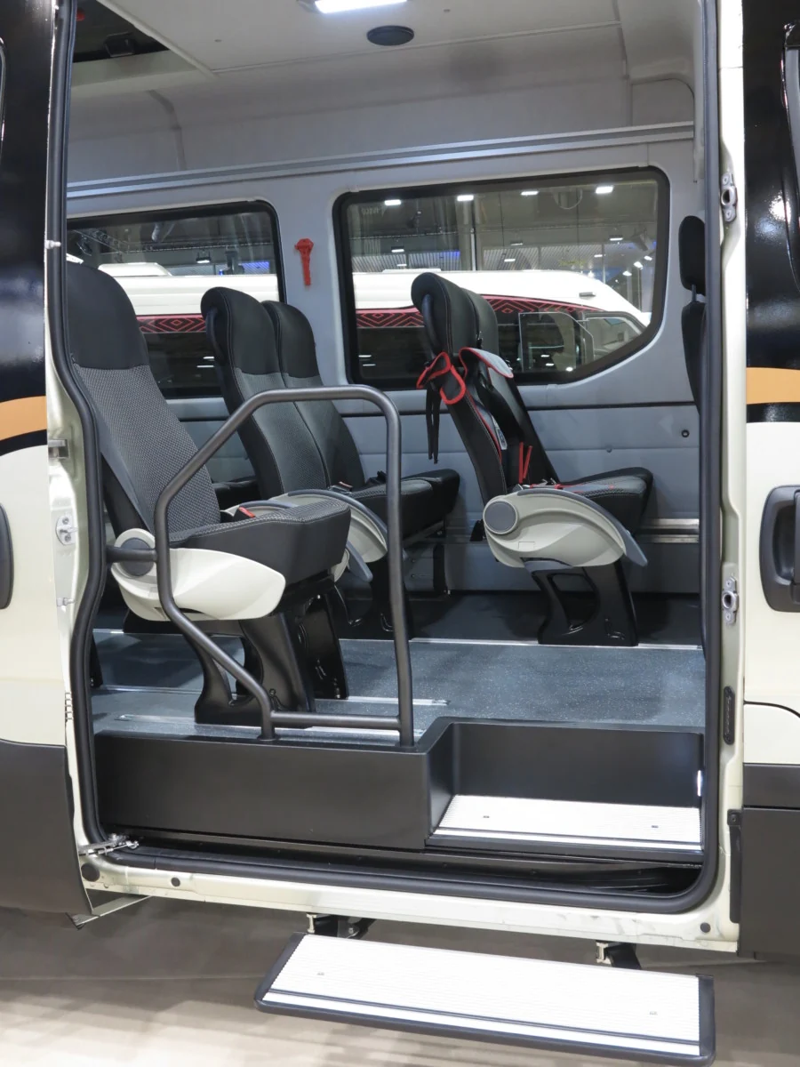 В комплектацию входит кондиционер и USB-разъемы. Для удобства посадки-высадки установлены широкая выдвижная подножка и большой поручень. Эта машина также оснащается 180-сильным турбодизелем и автоматической 8-ступенчатой коробкой передач.