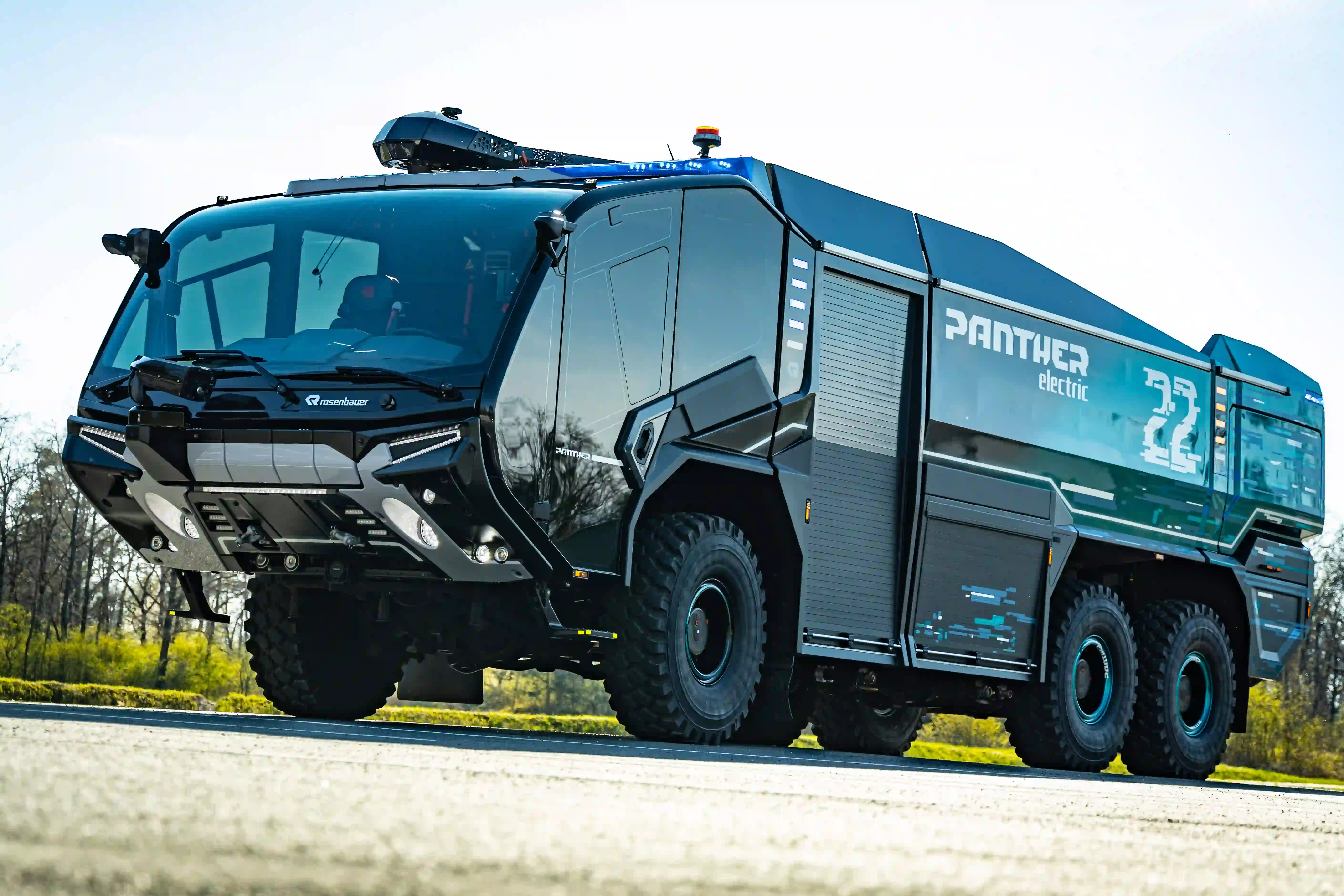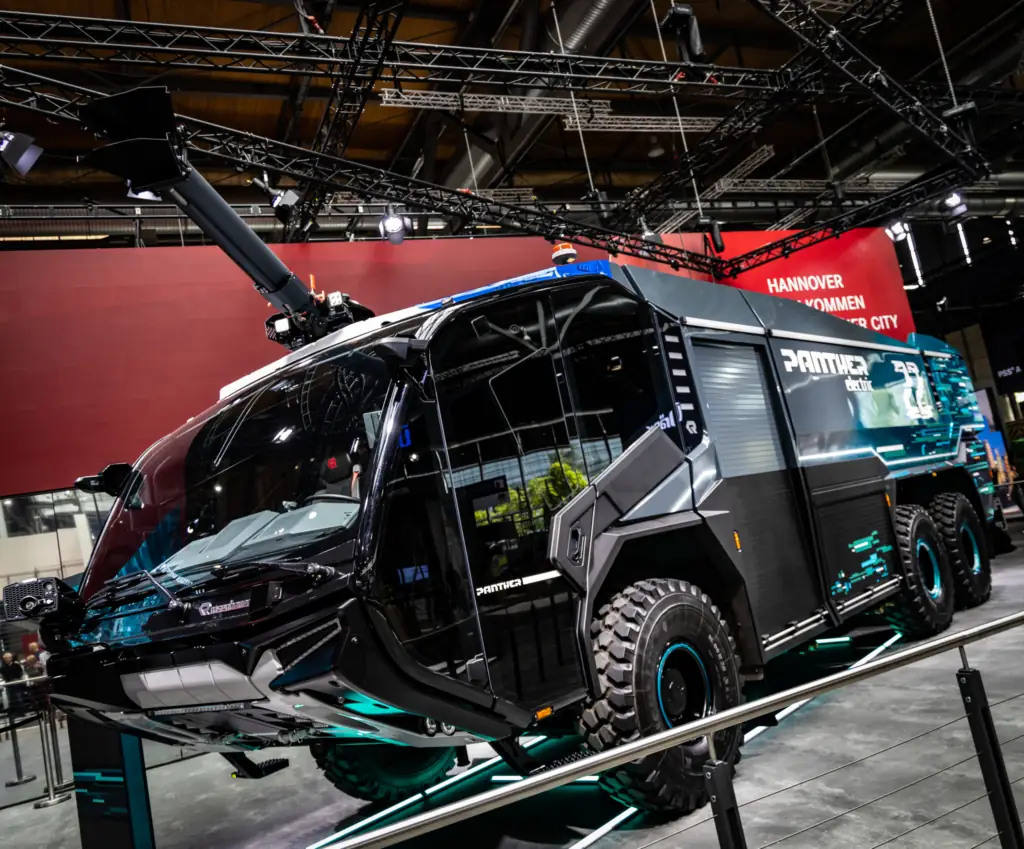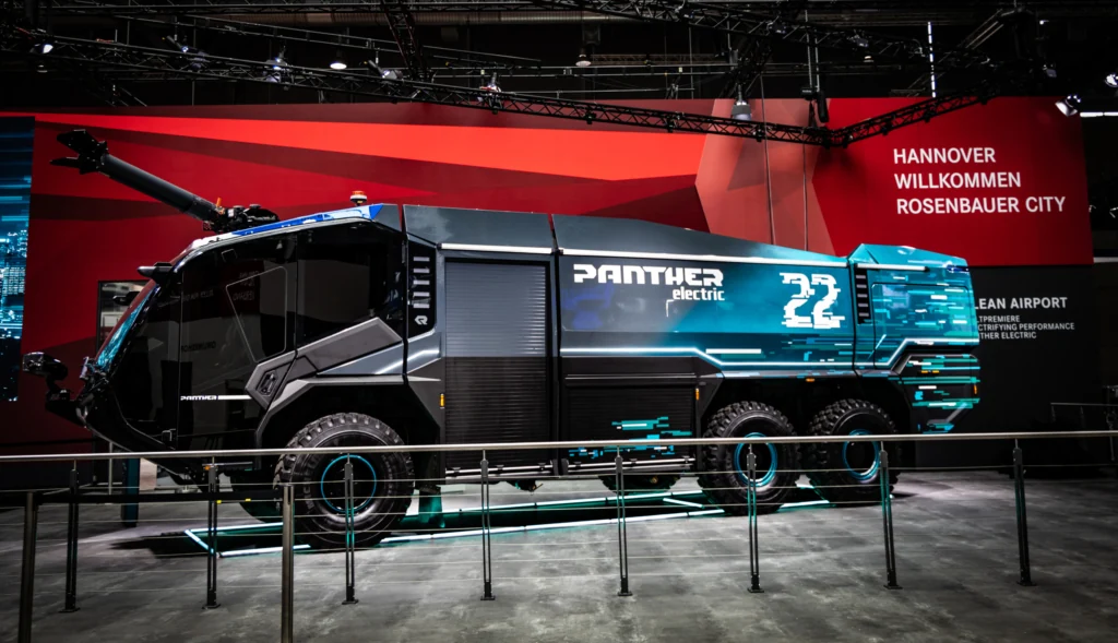На найбільшій виставці аварійно-рятувальної техніки Interschutz 2022 в Ганновері компанія Rosenbaurer презентувала аеродромний пожежний автомобіль Panther 6x6 на електротязі. Машина розроблена у співпраці з компанією Magna і має модульну електричну платформу — редуктор, електропривод, батареї.