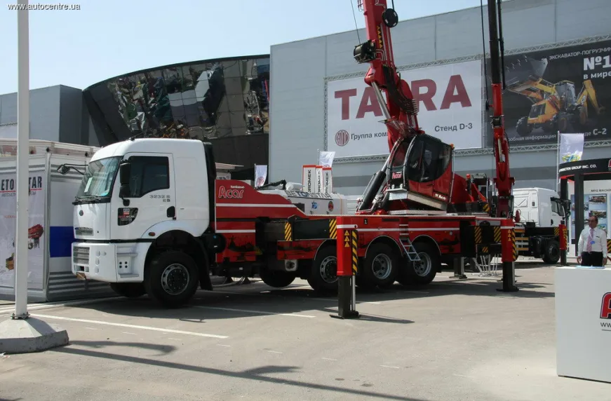 На международной выставке строительной техники СТТ-2014 были представлены два автомобиля Ford Cargo, оборудованные крановыми установками. Четырехосное шасси Сargo 3232S (8×2) – полной массой 32 т и двигателем мощностью 320 л.с. (Евро 5) демонстрировалось с эффектным, шарнирным краном. Краны с шарнирной стрелой (knuckle boom) имею два очень важных преимущества. Во-первых, в транспортном положении они занимают очень мало места. А во-вторых, благодаря «ломающейся», словно гусеница, стреле позволяют работать с грузом в труднодоступных местах (крыши домов, эстакады и др.). На выставке была показана модель автокрана 130 ТМ. Основная его стрела имеет вылет от 3,93 до 27,4 м. Грузоподъемность при этом составляет от 27,1 т до 2,74 т. Кроме того, имеется надставной «гусек», увеличивающий общий вылет стрелы до 37,5 м – правда, такой длинномер способен поднять только 305 кг. Для улучшения обзорности груза, кабина крановщика может наклоняться назад.