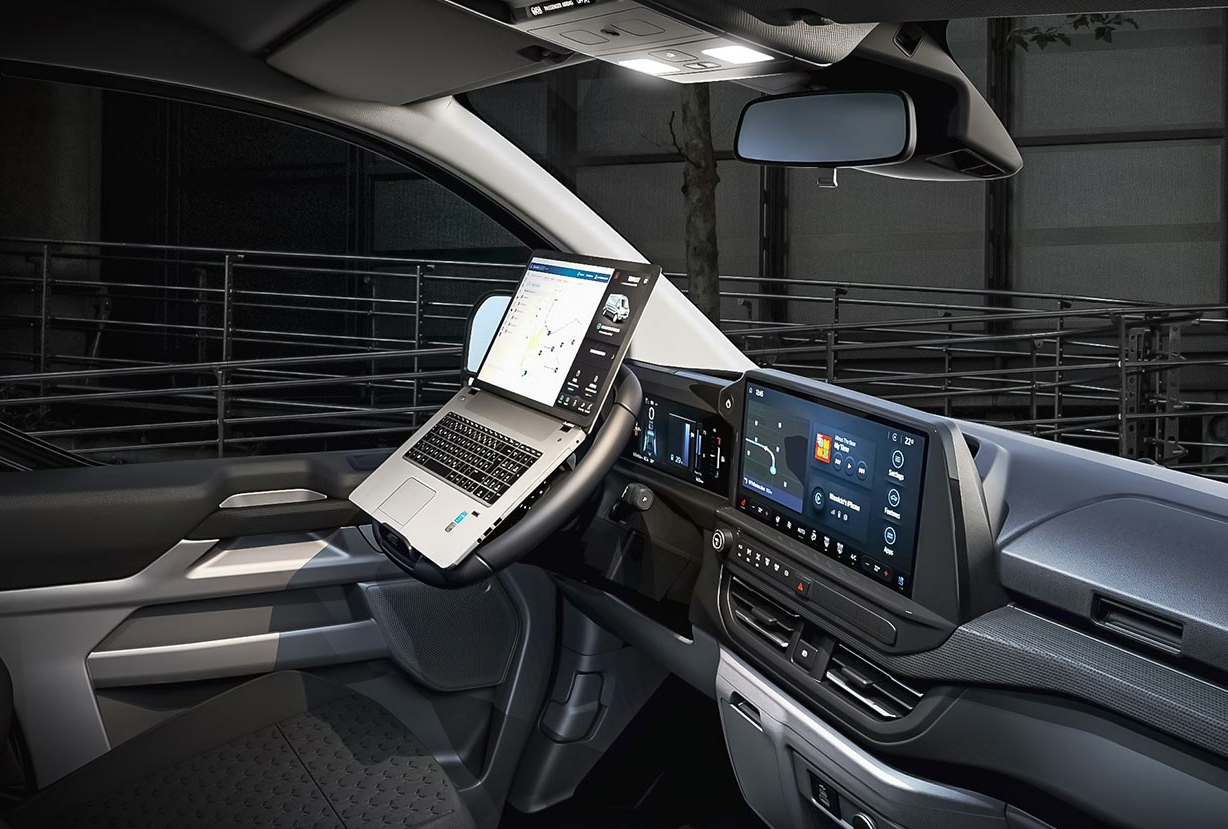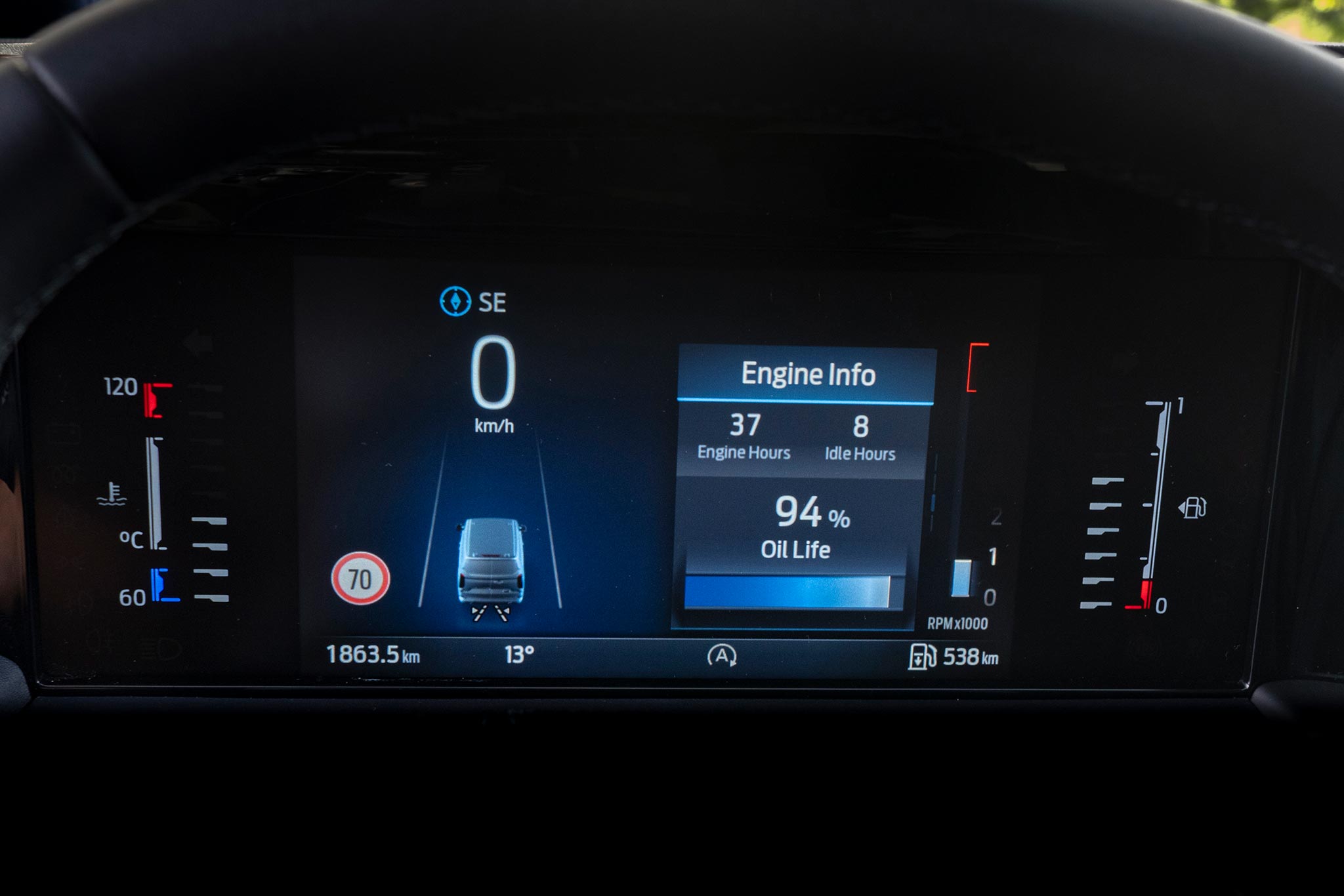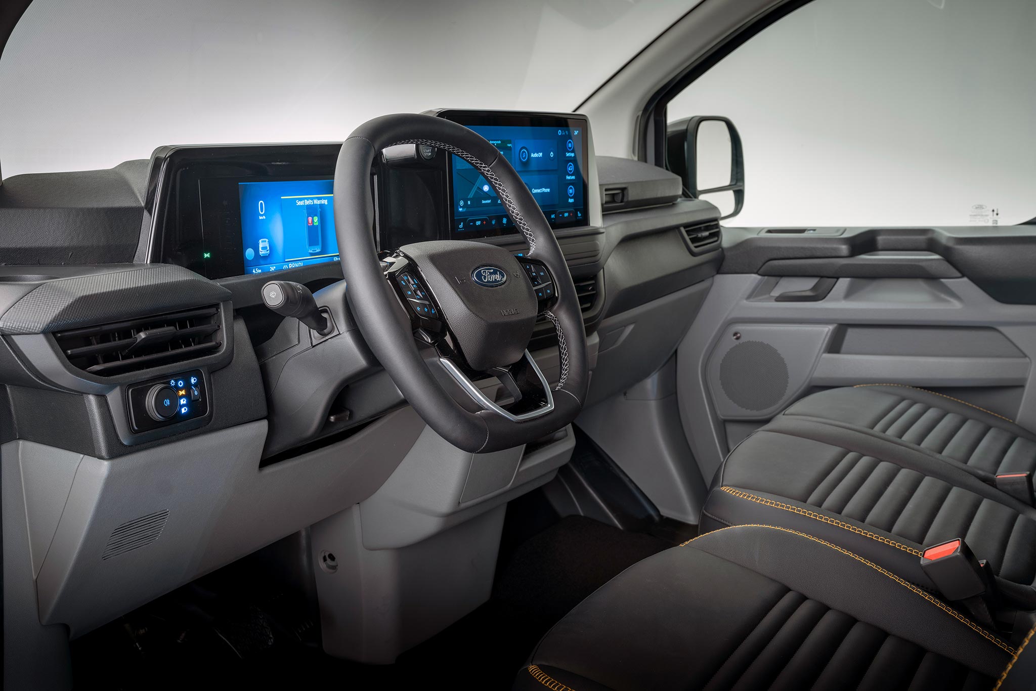 Водій також оцінить повністю новий інтер’єр. Встановлюються 12-дюймовий цифровий щиток приладів та 13-дюймовий екран тачскрин інформаційної системи Ford SYNC4. Доступ у кабіну полегшують кермо «квадратної» форми, електронне стоянкове гальмо та селектор автоматичної КП на рульовій колонці. Як опція доступний пакет Mobile Office з унікальною системою трансформації рульового колеса, яке служить зручною підставкою для роботи з ноутбуком, паперовими документами, а також невеликим обіднім столиком.