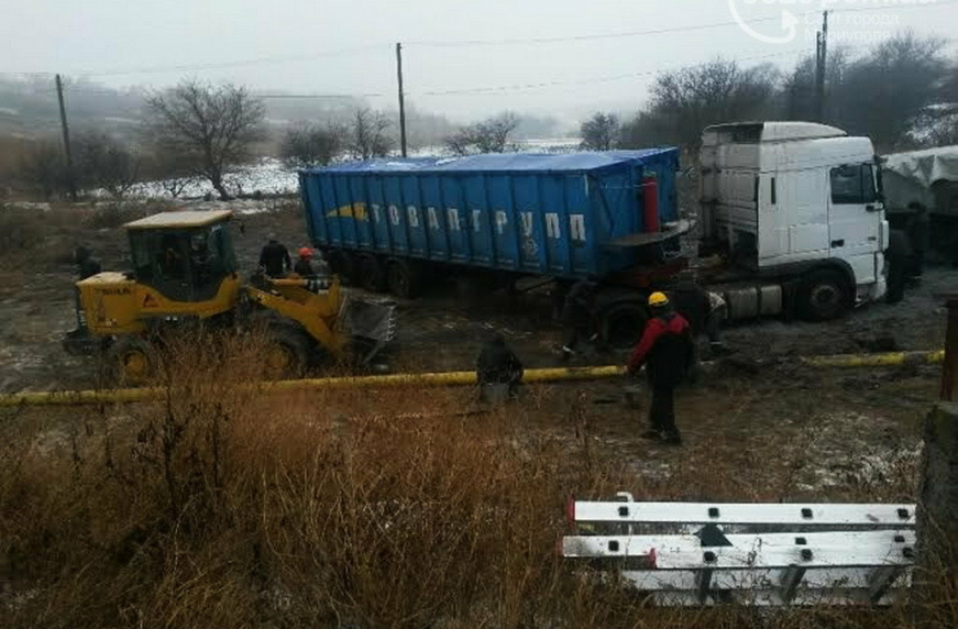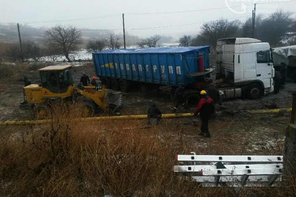 Необычное дорожно-транспортное происшествие произошло на днях под Мариуполем, Донецкая область. Временно поселок Шлях Ильича остался без газоснабжения, но аварийная служба устранила поломку и сейчас газ в поселке есть, сообщает портал www.0629.com А произошло здесь следующее. Автопоезд в составе седельного тягача DAF и самосвального полуприцепа, перевозивший, по всей видимости, сыпучий груз, слетел с дороги.