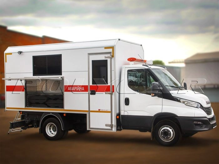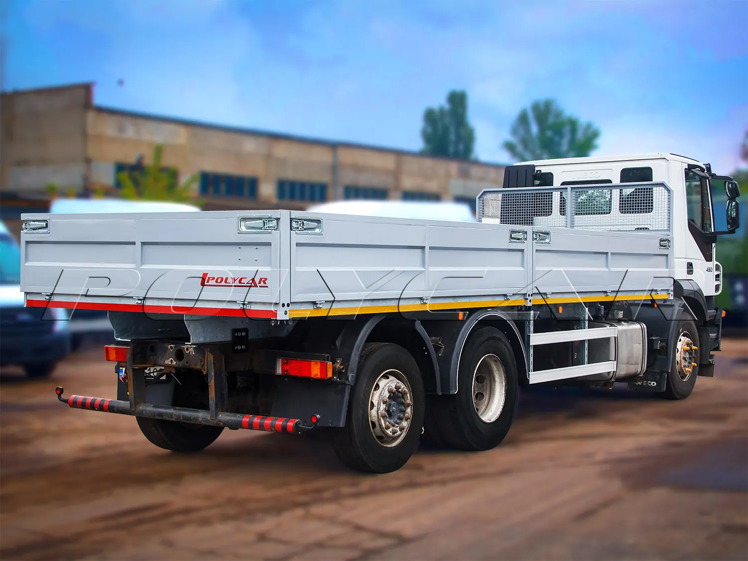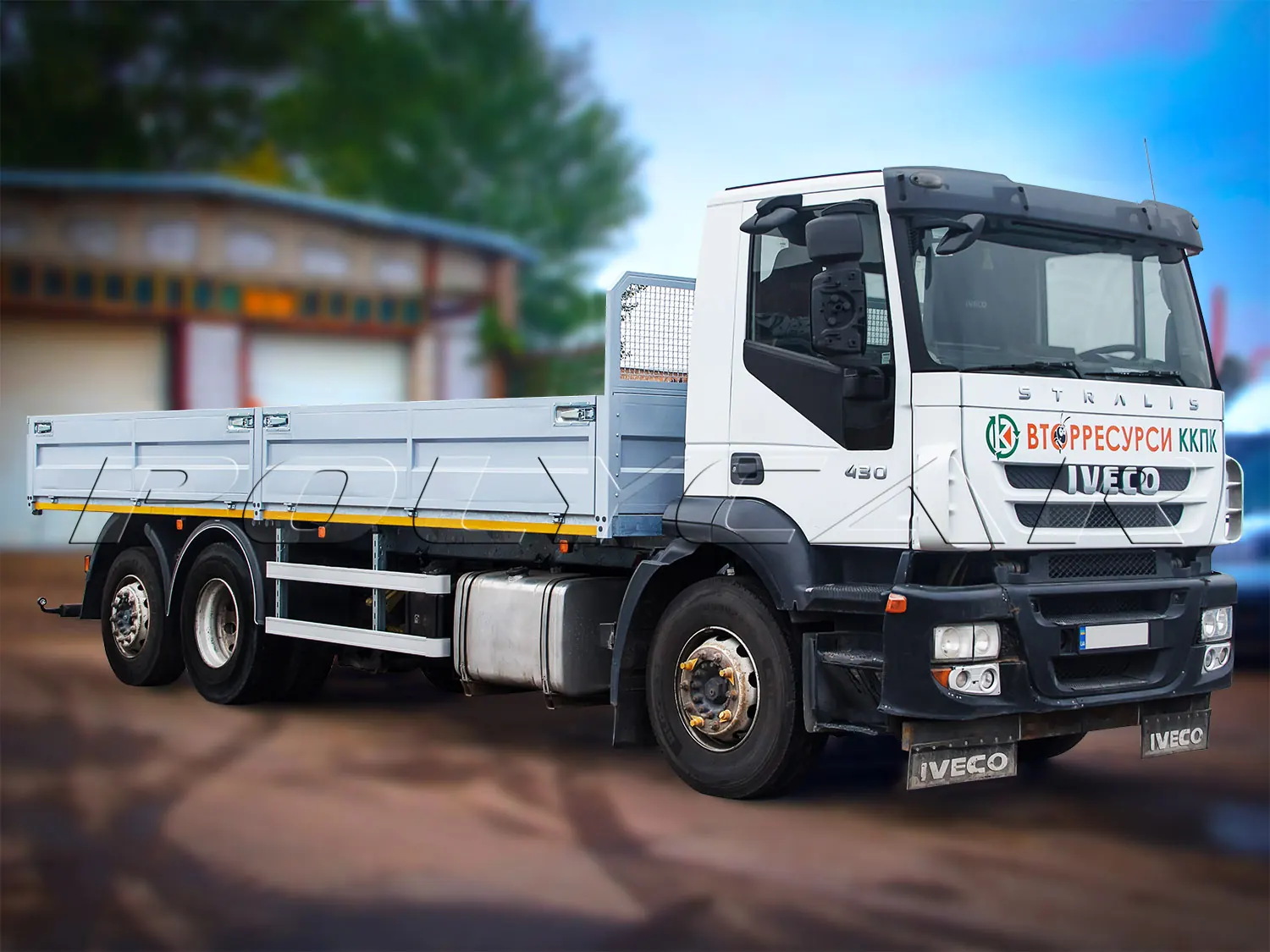 Що ж до другого шасі – моделі IVECO Stralis 430, то його оснастили бортовою платформою. Для виробництва бортів використано посилений металевий профіль з додатковим антикорозійним покриттям. Борти розділені посередині стійкою. Підлога покрита зносостійким рифленим металевим листом товщиною 3 мм. Надійно зафіксувати вантаж допоможуть такелажні петлі. Також є передній захисний каркас.