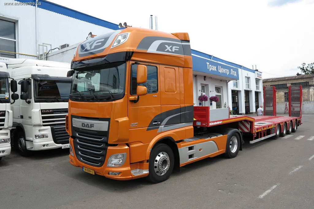 Представитель тяжелой серии DAF – тягач XF c двигателем Евро 6 мощностью 510 л.с. и самой просторной кабиной Super Space Cab. Машина показана в сцепке с прицепом-тяжеловозом марки Kaessbohrer