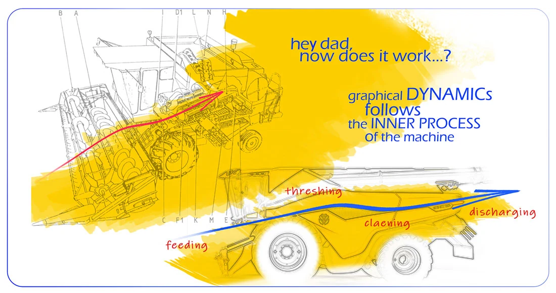 Особливу увагу приділено кольоровій гамі: контрасту фірмового, яскраво-жовтого забарвлення із чорним. На борту розташований повітрозабірник, який оптимізує форми. А трохи вище можна побачити хвилястий графічний елемент синього кольору, який натхненний процесом обробки зерна всередині комбайна. Важливою перевагою нового дизайну є легка адаптація для різної сільгосптехніки: наприклад, для трактора T7 Methane Power – LNG.