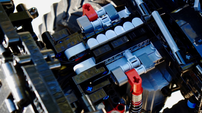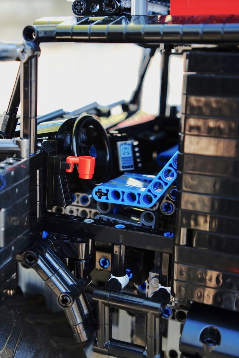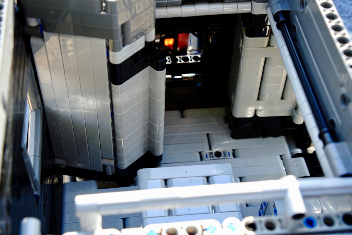Вместо топливных баков – два блока питания, в котором по шесть пальчиковых батареек типа АА. Такое мощное питание необходимо как для многочисленных электромоторов, так и для 14 светодиодов – для фар, задних фонарей, указателей поворотов и внутреннего освещения кабины.