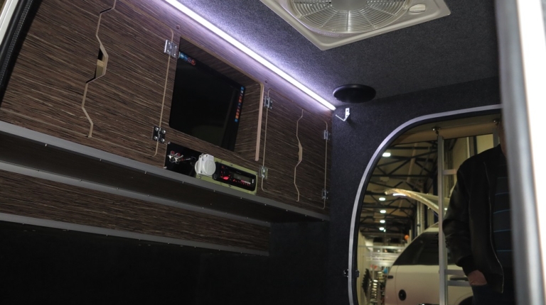 Усередині є широке двоспальне ліжко, плоский телевізор, аудиостсема, можливе встановлення автономного підігрівача Webasto. У задній частині встановлено газову плиту на дві конфорки, рукомийник, холодильну камеру, бак з водою і шафки для посуду.