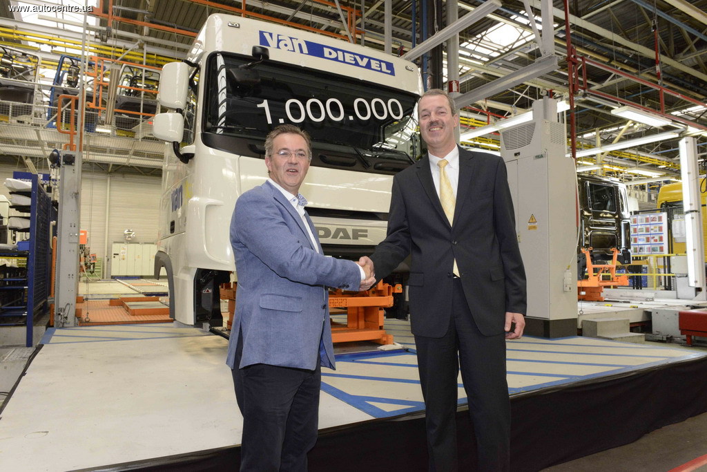 В начале июля на заводе DAF Vlaanderen в бельгийском городе Оэвель (Oevel) со сборочного конвейера сошла юбилейная, миллионная по счету кабина для грузовика. «Это огромная веха в истории завода DAF, выпускающего мосты и кабины для своих грузовиков», – отметил президент компании DAF Trucks Гарри Сшипперс (на фото справа). Голландская компания DAF Trucks открыла свое предприятие в Бельгии еще в 1966 году. Здесь начали производить кабины для грузовиков, а затем, в 1971 году – и мосты к ним.