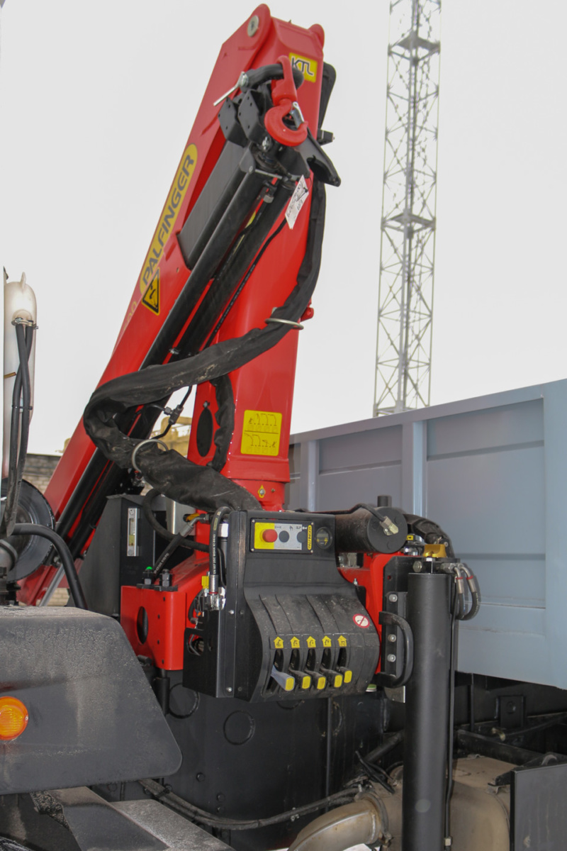 Краны-манипуляторы Palfinger, максимальной грузоподъемностью 3100 кг, имеют вылет стрелы 9,6 м, момент подъема – 75 кНм, угол поворота – 400º; полнофункциональный пульт управления с обеих сторон, грузоподъемность на конце стрелы – 720 кг, гидравлическую систему защиты от перегрузки, кнопку аварийного выключения.
