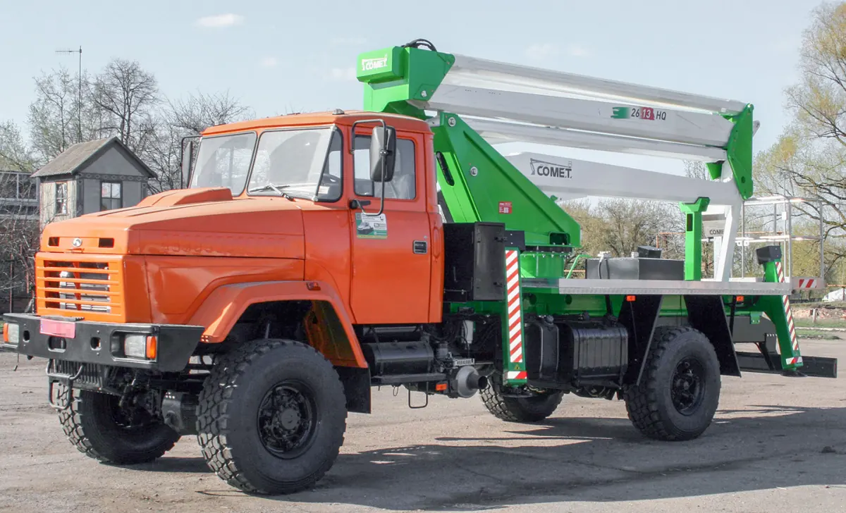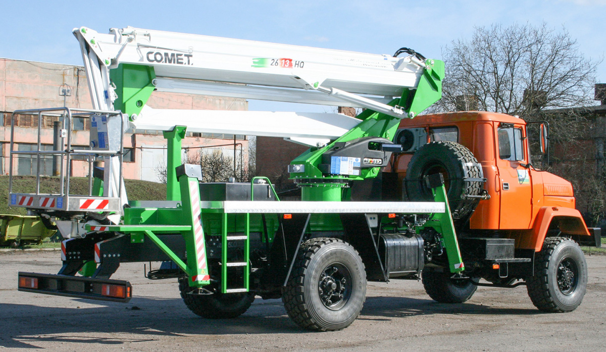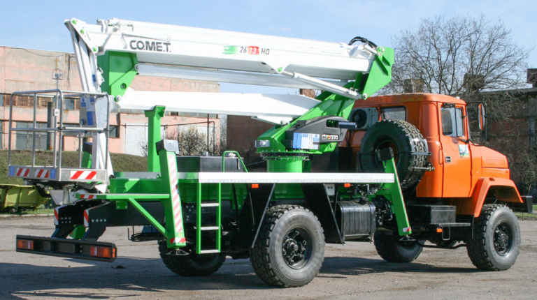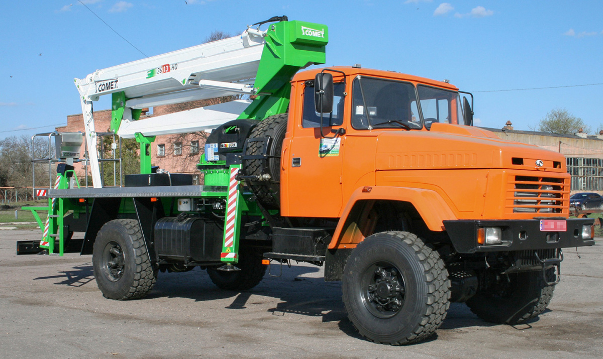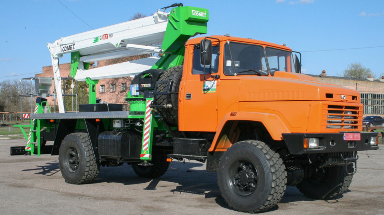 Необычный грузовик 4х4 с индексом ТК-К-5233 AGP 26 «АвтоКрАЗ» подготовил для своего давнего клиента – Полтавского горно-обогатительного комбината. В основу было положено шасси КрАЗ-5233НЕ (4х4), на которое установили локтевой автоподъемник известного итальянского бренда OfficineComet. Максимальная высота подъема составляет 26 м, а вылет 0 12 м. Угол поворота – 360 градусов, люлька грузоподъемностью 250 кг также поворачивается на 90+90 градусов.