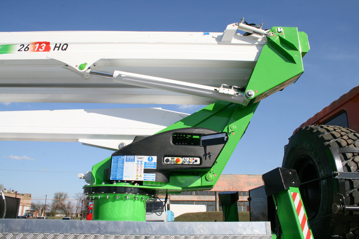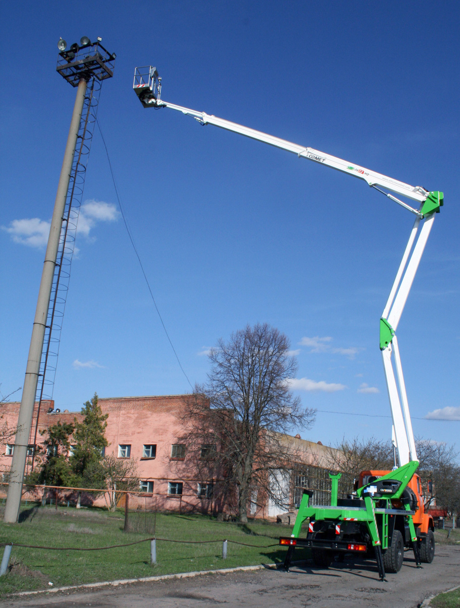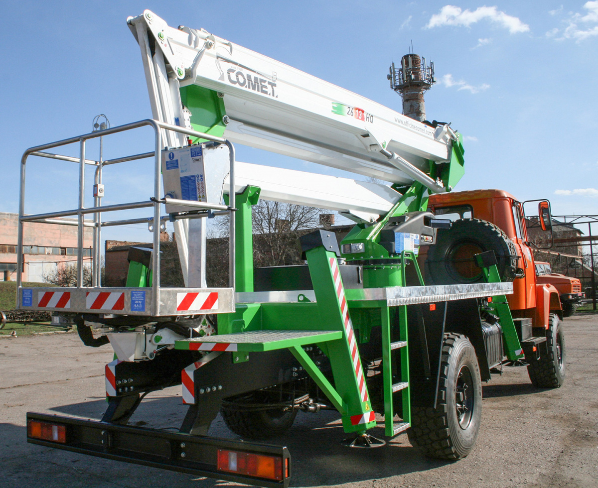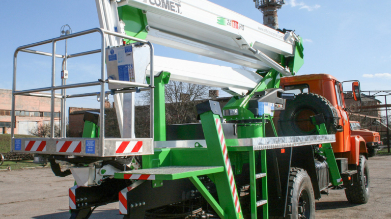 Необычный грузовик 4х4 с индексом ТК-К-5233 AGP 26 «АвтоКрАЗ» подготовил для своего давнего клиента – Полтавского горно-обогатительного комбината. В основу было положено шасси КрАЗ-5233НЕ (4х4), на которое установили локтевой автоподъемник известного итальянского бренда OfficineComet. Максимальная высота подъема составляет 26 м, а вылет 0 12 м. Угол поворота – 360 градусов, люлька грузоподъемностью 250 кг также поворачивается на 90+90 градусов.