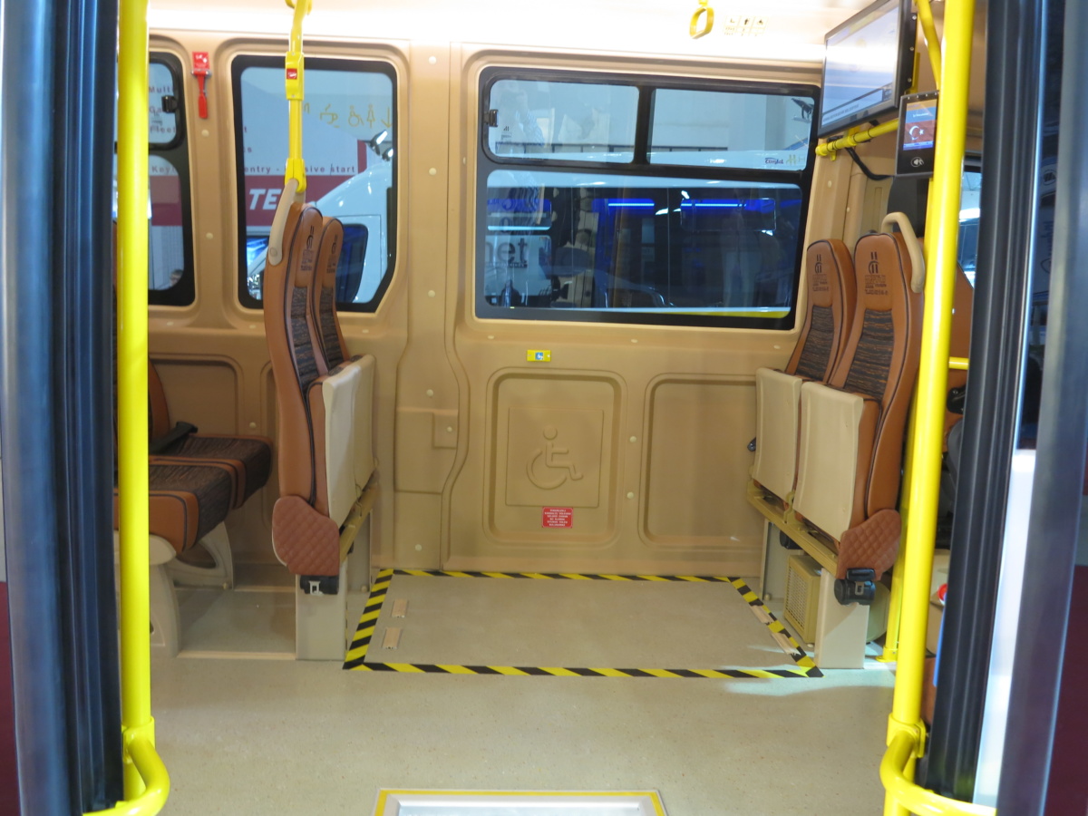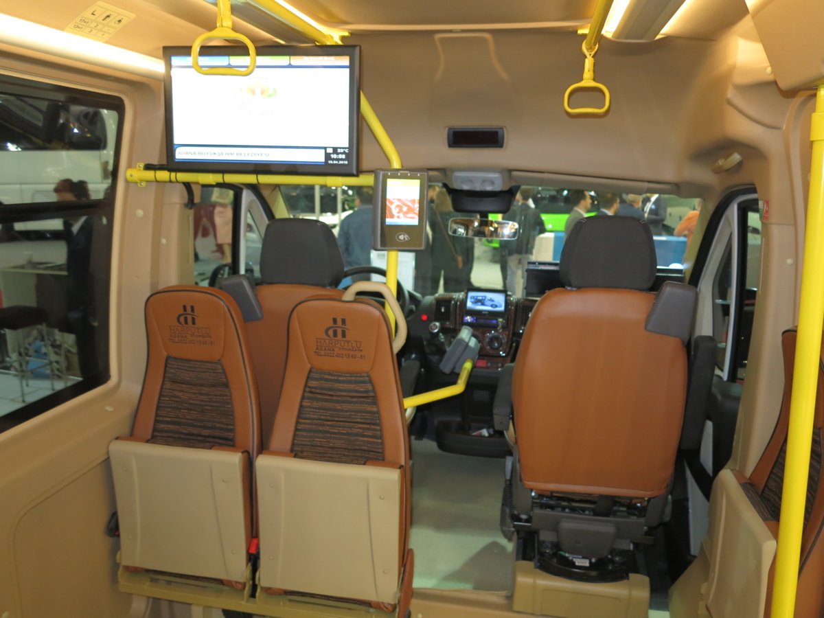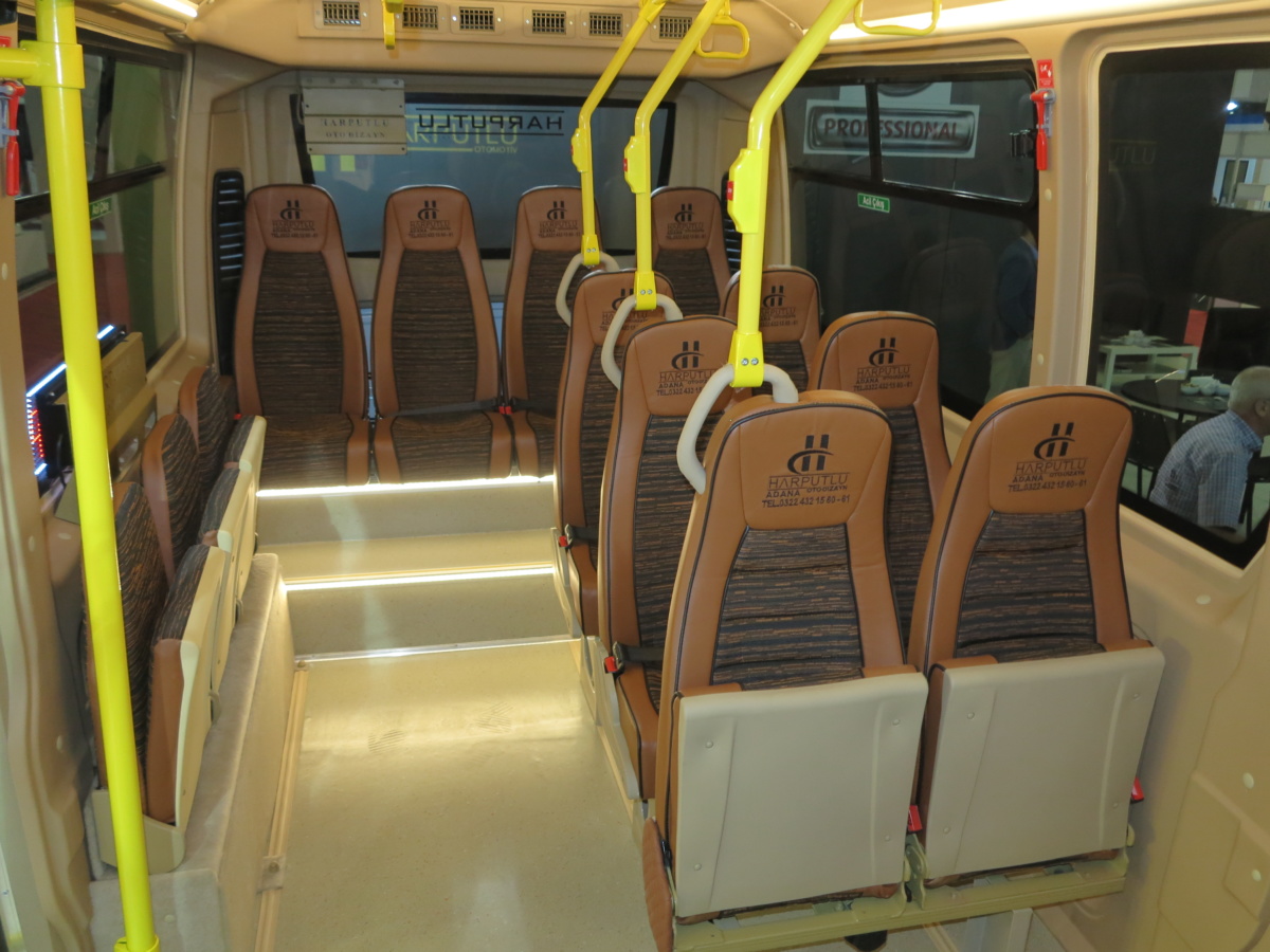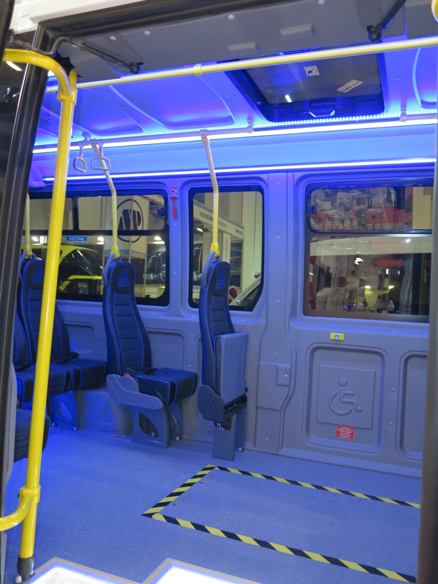 Одна из маршруток Harputlu на Busworld Turkey 2018 – белого цвета – имеет 20 пассажирских сидений, три из которых справа по борту сделаны откидными – пассажиры сидят лицом к проходу как в метро.