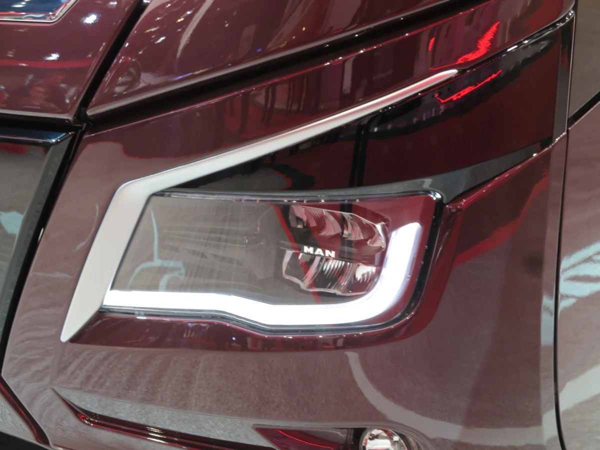Внешне новый MAN Lion’s Coach можно узнать по увеличенной и более угловатой черной панели с логотипом марки, а также фарам с черными «ресничками». Что же касается задней светотехники, то она впервые уже в стандарте устанавливается полностью на светодиодах LED.