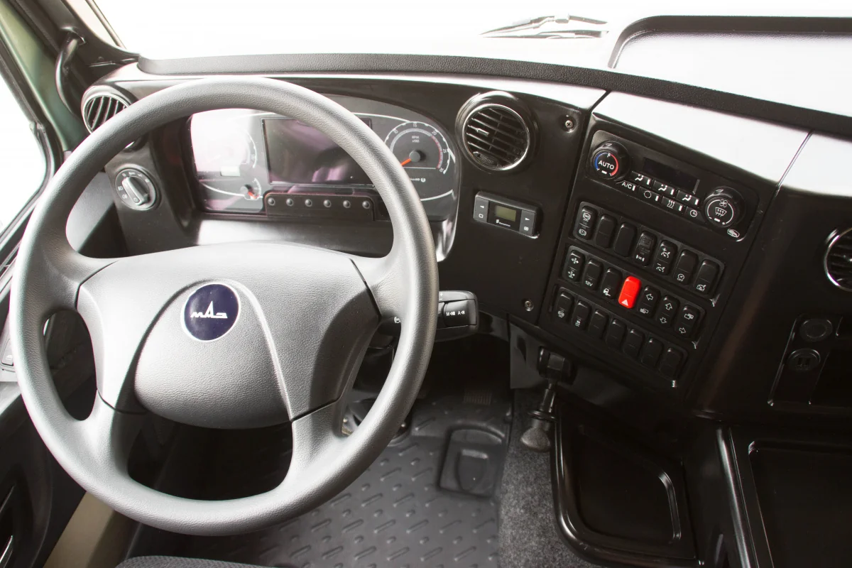 Грузовик получил полностью обновленный интерьер. По сравнению с прототипом, кабина отличается повышенной шумоизоляцией и оснащена новой панелью приборов, полками и двумя багажными отсеками по 200 литров каждый. Внутри установили холодильник и два увеличенных спальных места. В базовый комплект входят мультиплексная система управления с электронным щитком приборов и встроенным бортовым компьютером, климат-контроль, круиз-контроль и мультимедийная система. За акустику отвечают четыре динамика – по два с каждой стороны. Места для водителя и пассажира стали просторнее, а управлять автомобилем предлагается в сиденьях европейской компании ISRI.