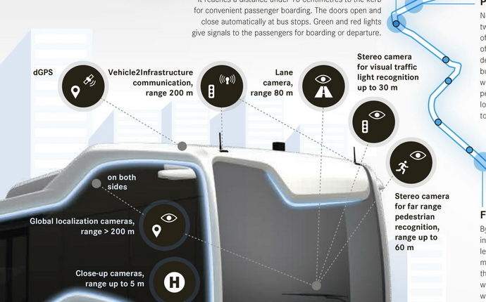 Водій не торкається ні педалі газу, ні педалі гальма. Складна система камер і датчиків (ближнього і далекого радіусу дії) стежать за дорогою, а також за світлофорами. Також постійно аналізується інформація GPS- навігації. Автобус плавно гальмує на зупинках і плавно набирає швидкість. У разі виникнення перешкоди на дорозі автоматично активується гальмівна система.