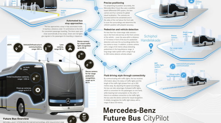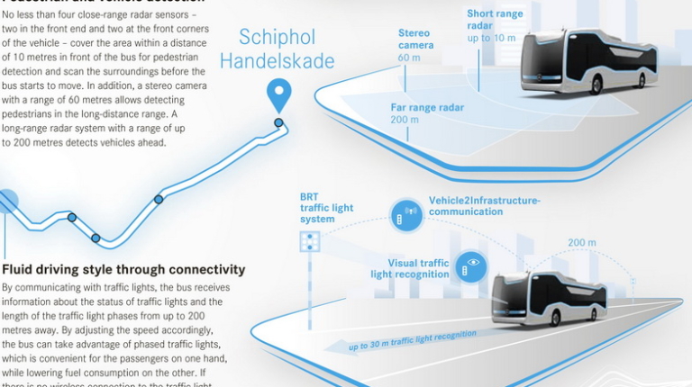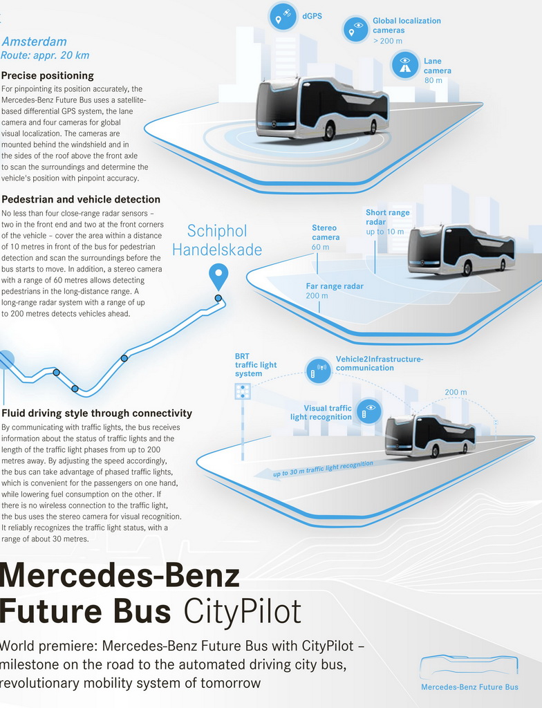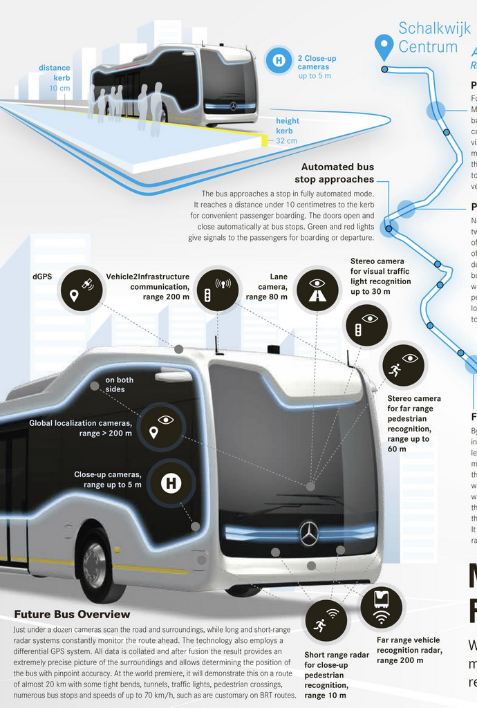 Автобус Mercedes -Benz CityPilot показали у дії в Амстердамі – на найдовшій в Європі лінії швидкісного автобусного сполучення BRT, завдовжки 20 км. Машина сама може визначати, чи підходить конкретна ділянка дороги для автономного керування – і подає водієві відповідний сигнал. Той у свою чергу натискає кнопку, і керування автобусом переходить у безпілотний режим.