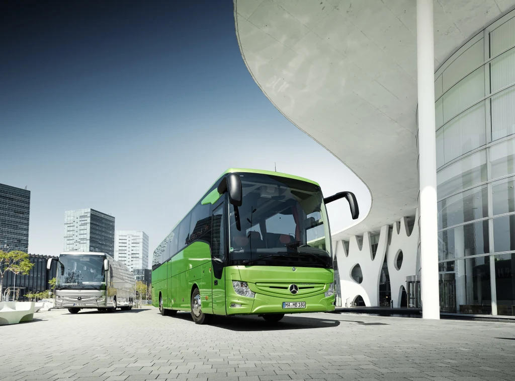 В разработку нового Mercedes-Benz Tourismo RHD было инвестировано ни много ни мало 400 млн. евро. Автобус не только отличается оригинальным дизайном – изогнутая головная оптика, унифицированная с Mercedes-Benz Actros, а также оригинальные, словно парящие в воздухе средние стойки крыши.