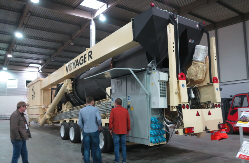Здесь представлена модель Voyager 120 производительностью 120 тонн асфальта в час. Самое необычное, что завод помещается на двух полуприцепах-тяжеловозах – полной массой 18 и 42 т и перевозится обычными седельными тягачами.