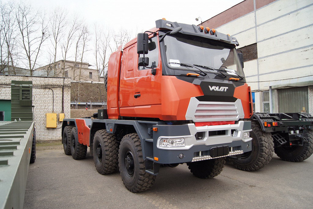 Полноприводный седельный тягач МЗКТ-750440-010 (8х8) может транспортировать грузы в составе автопоезда с максимальной массой до 90 тонн. Новинка интересна еще и тем, что это первый тягач Volat, отвечающий экологическим стандартам Евро 5.