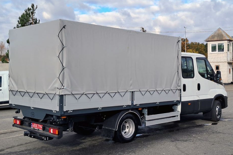 На шасі Daily 35C14D було встановлено тентовану платформу з алюмінієвими бортами власного виробництва – розміром 3700 х 2200 х 1700 мм. Її відмінність – система шнурівки тенту не крізь петлі, а за допомогою еспандера. Це дозволяє розчехлити борти за хвилину. Все це забезпечує швидкий доступ до спеціалізованого обладнання усередині.