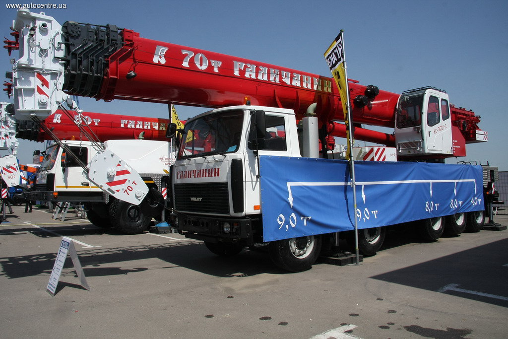 Вторая новая модель Галичского автокранового завода – КС-74713 имеет грузоподъемность 80 т и предназначена для полного бездорожья. В ее основу положено полноприводное шасси МЗКТ-790200 колесной формулы 10х10. Здесь установлен турбодизель Тутаевского моторного завода ТМЗ-8431.10 мощностью 470 л. с., выдающий 1864 Нм максимального крутящего момента при 1300-1500 об/мин. Автокран оснащен 5-секционной стрелой овоидного типа. Управление краном – электропропорциональное, что позволяет совмещать крановые операции и обеспечить плавность их выполнения. В гидросистеме применяются комплектующие фирмы Hydac (Германия). Немаловажно, что автокран оснащен системой LS, которая регулирует расход рабочей жидкости, что помогает экономить топливо.