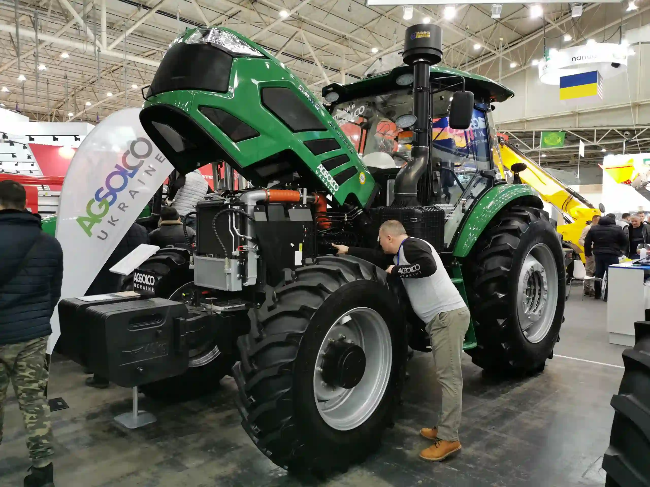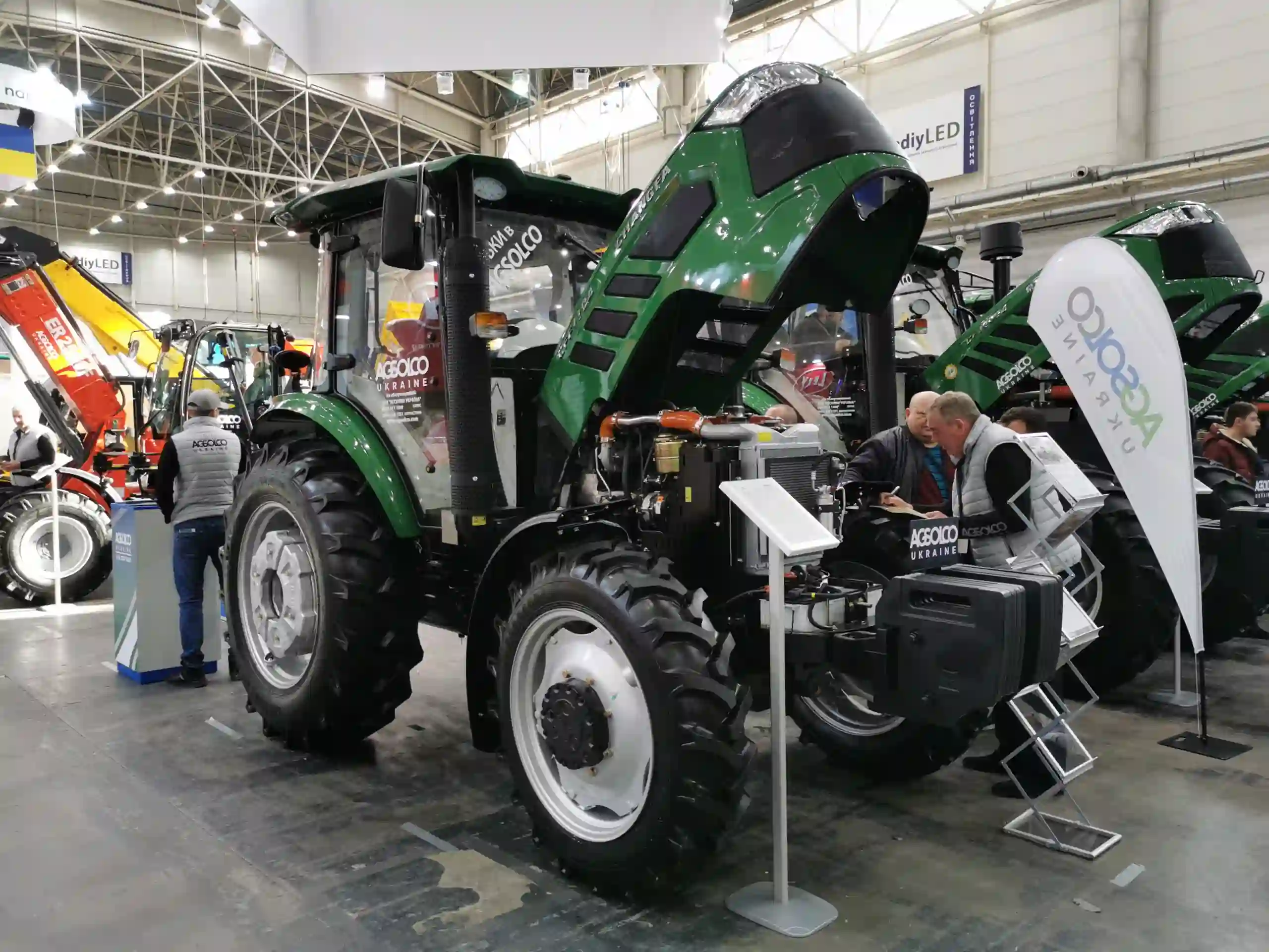 На стенді компанії "Агсолко Україна" хочеться відзначити колісні трактори китайської марки Сhangfa. Тут можна побачити модель СFF1104 - із підйомним зусиллям задньої навіски 3000 кг і дизельним двигуном YC4A130-T311 потужністю 130 к.с. (430 Нм). Кількість передач — 32 вперед і 32 назад. Операційна маса дорівнює 4600 кг.