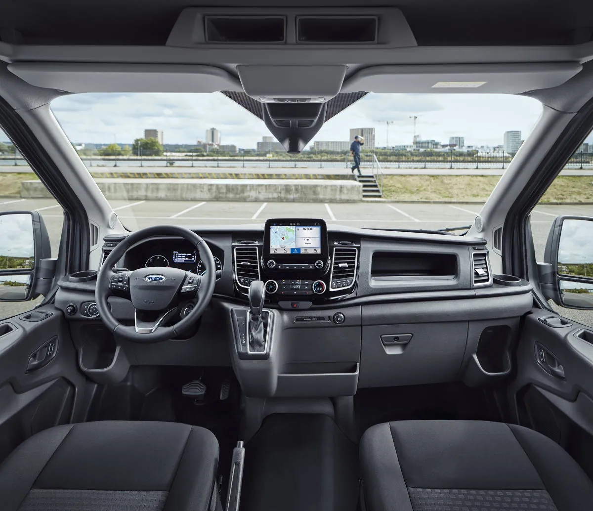 Аналогично Ford Transit Custom последнего поколения, новый Transit имеет полностью обновленный дизайн интерьера, более привлекательный внешне, а также более практичный и комфортный для водителя. Новая передняя панель удобна для водителей, использующих кабину в качестве мобильного офиса, в том числе значительно улучшено пространство для хранения, которое теперь состоит из трех открытых отсеков наверху передней панели; новая док-станция для подключения приборов и устройств в базовых комплектациях позволяет водителям подключать как мобильные телефоны, так и более крупные современные планшеты.