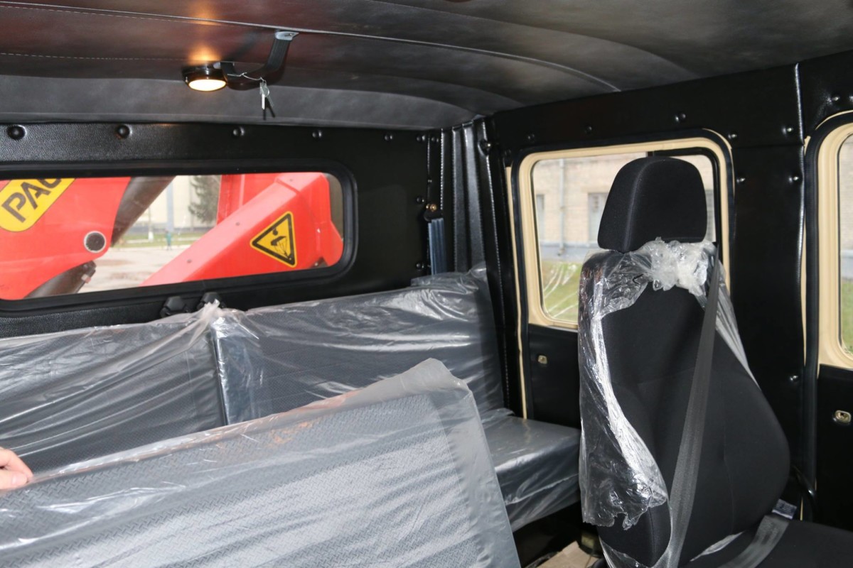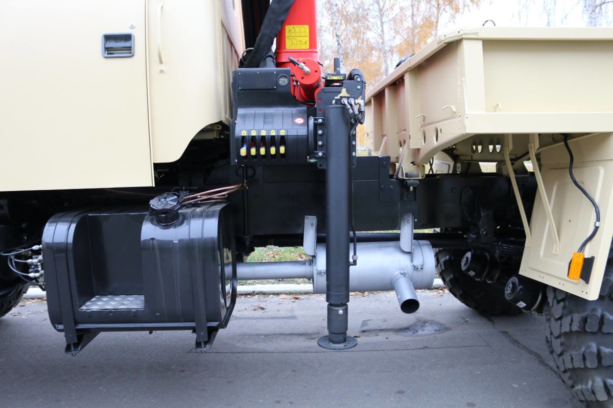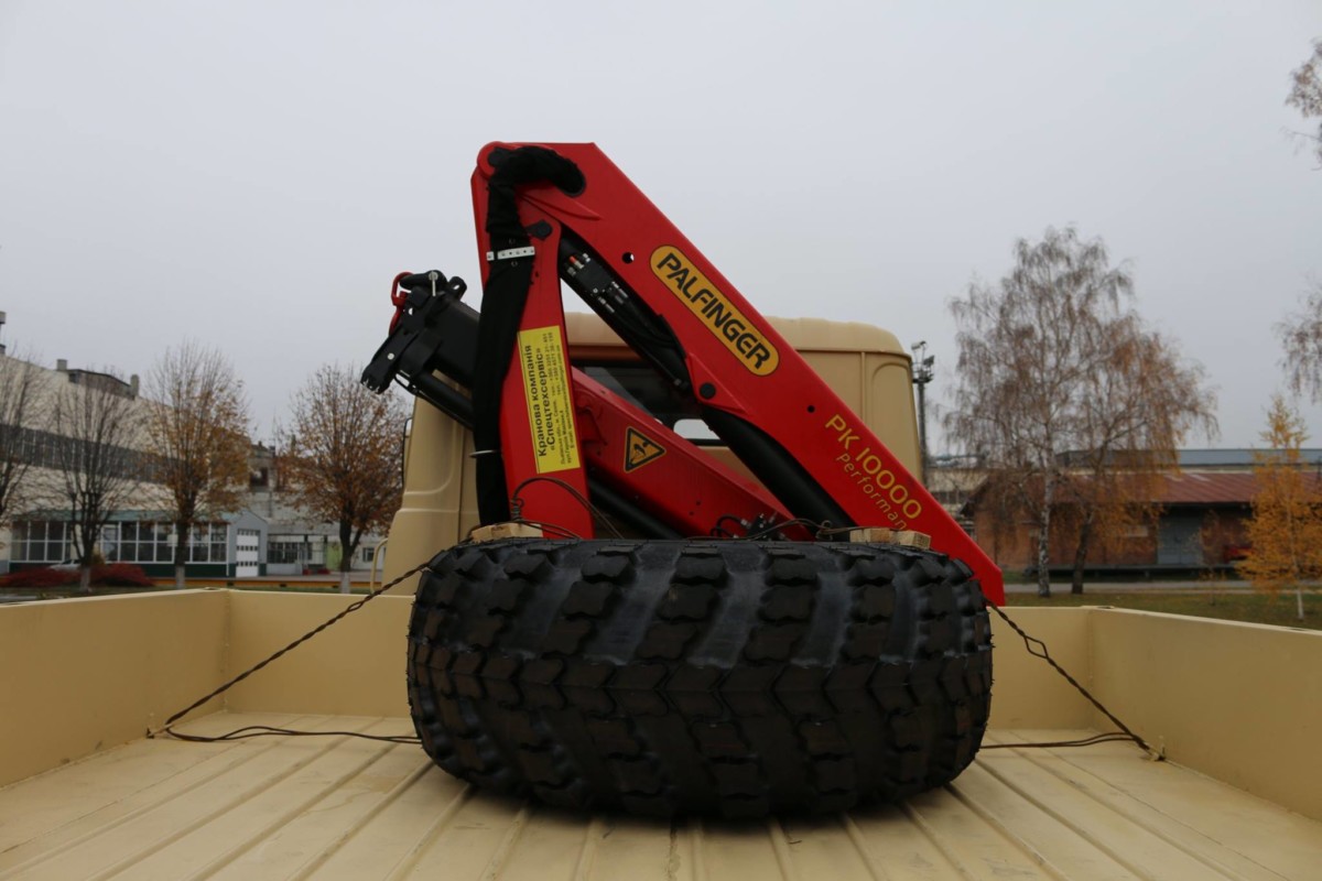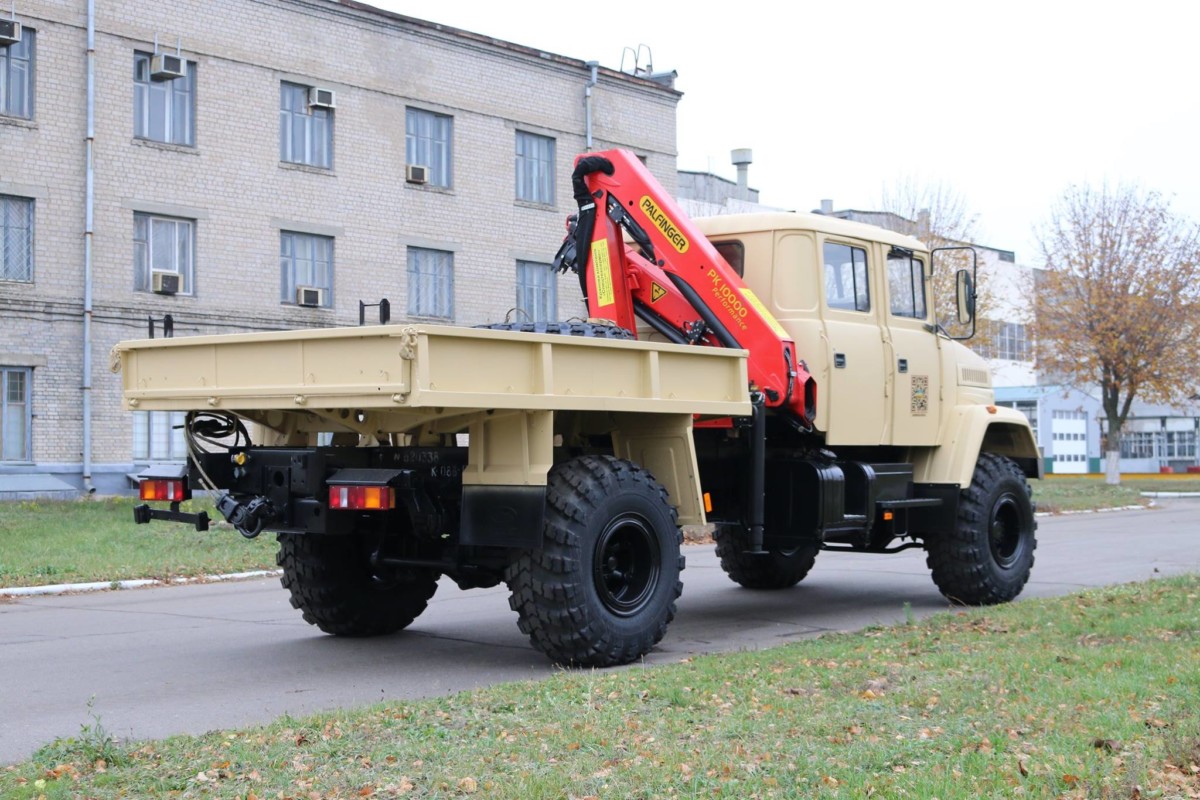 Необычность «летучки» КрАЗ в том, что она оснащена двухрядной кабиной на 7 человек. Сразу за ней смонтирован кран-манипулятором с вылетом стрелы до 8,2 м и грузоподъемностью от 1120 до 5580 кг. Установка удлиненной кабины и крана потребовало сместить назад металлическую бортовую платформу.