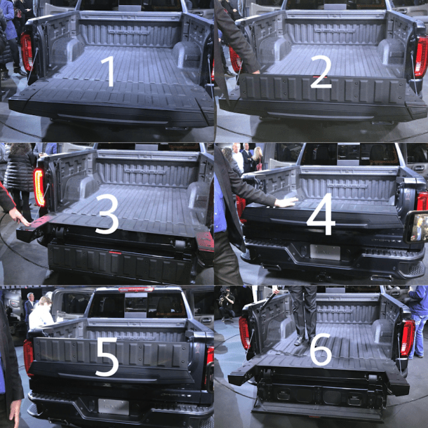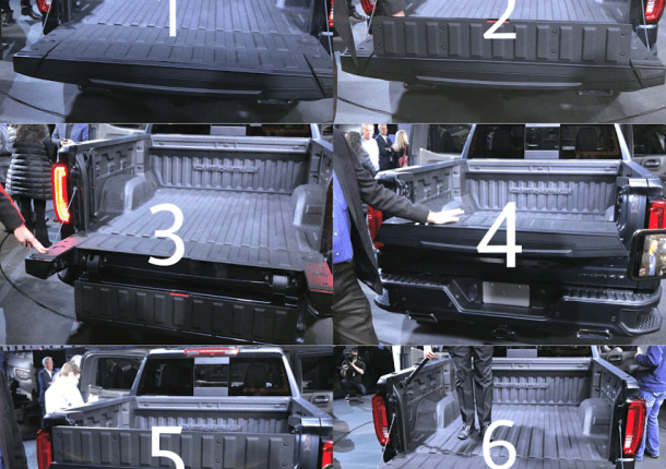 Напомним, что представленный прошлой весной пикап GMC Sierra Multi Pro также получил на вооружение многофункциональный задний борт. Он также сделан двухсеционным, однако в отличие от Ram 1500, имеет горизонтально открываемые половинки. В итоге получается четыре различные комбинации.