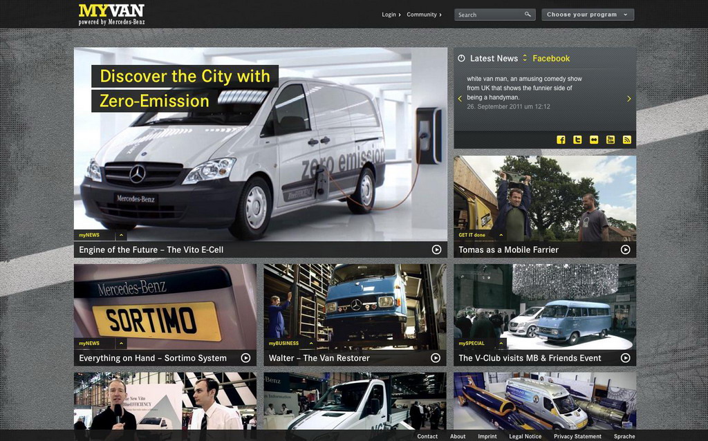 MYVAN, предлагаемое подразделением Mercedes-Benz Vans, представляет собой первое в мире международное социальное телевидение, где в режиме онлайн происходит диалог между продавцами легких развозных автомобилей и целевой аудиторией. На страничке www.MYVAN.сом полезная информация будет представлена через видеоролики по нескольким разделам, на английском и немецком языках.