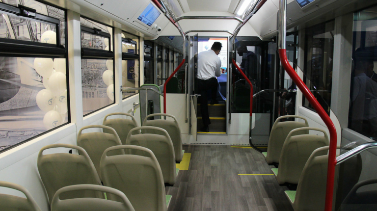 Интересно, что основными как раз являются прицепные батареи, а вот резервные (емкостью 50 кВт.ч.) электробус имеет на крыше. Последние задействуют лишь тогда, когда батареи в прицепе полностью разряжены.